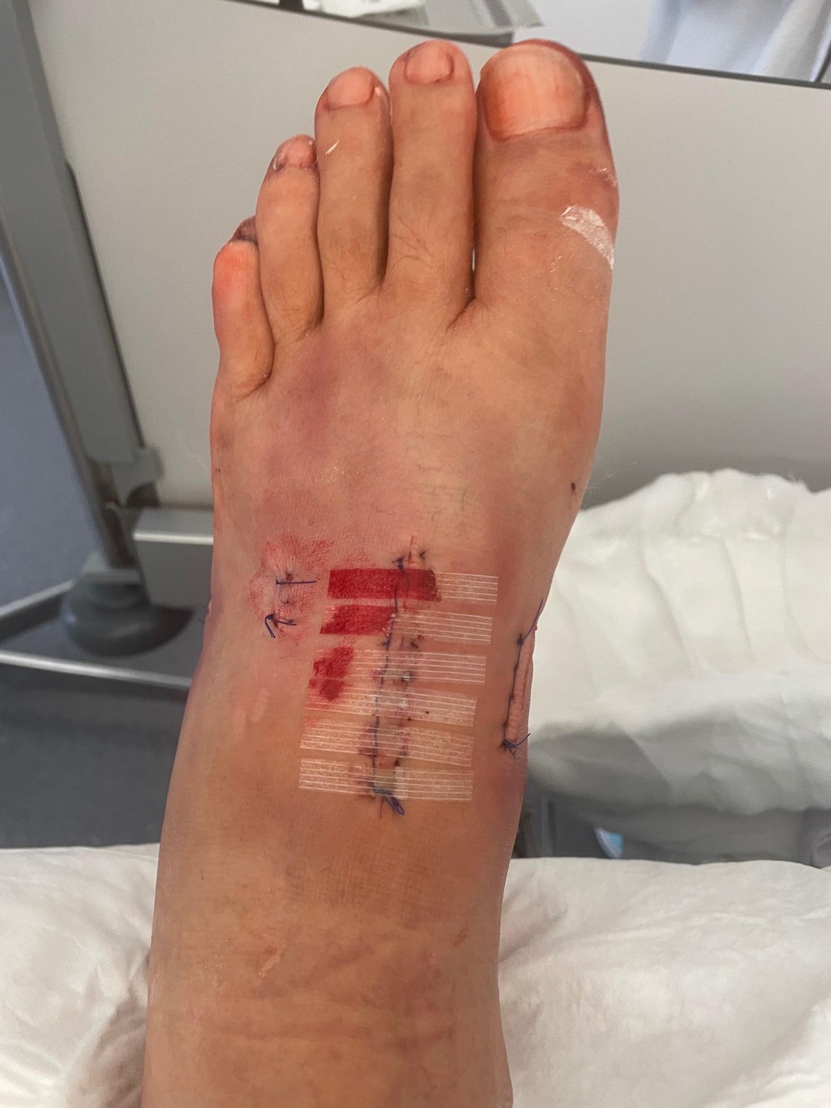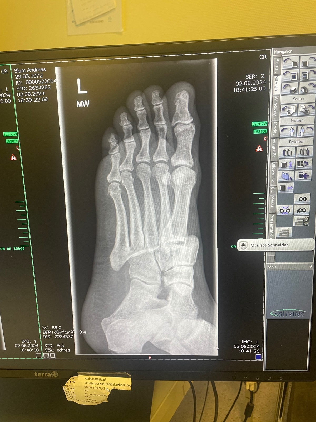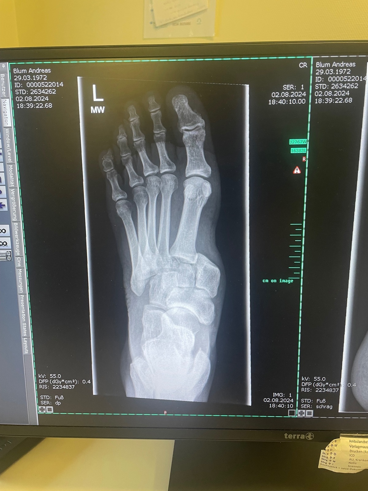 Offensichtlich traf meine Fußraste oder ein anderes hervorstehendes Teil meinen Vorderfuß und klemmte den ein. Die Folge: alle Mittelfußknochen wurden aus der Position gedrückt und etwa „eine Zehe“ weiter nach links verschoben.