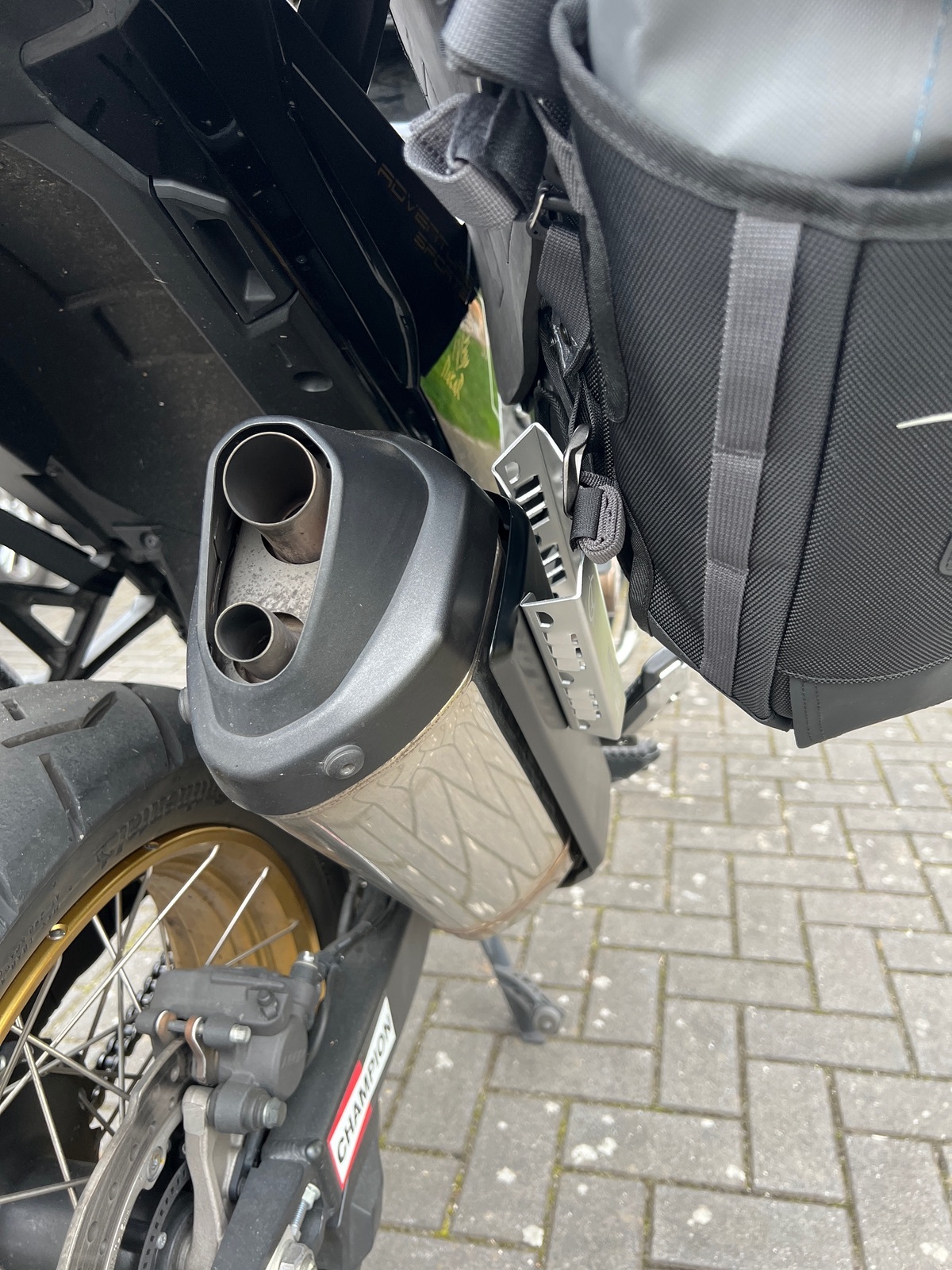 PS: was ich auch probiert habe ist, die Standard 20 Liter Hecktasche von Mosko gegen eine 30 Liter Tasche von SW Motech auszutauschen, das passt auch hinten zwischen die beiden Taschen rechts und links. Und wird dann auch einfach unter die normale Befestigungs-Lasche verzurrt.
