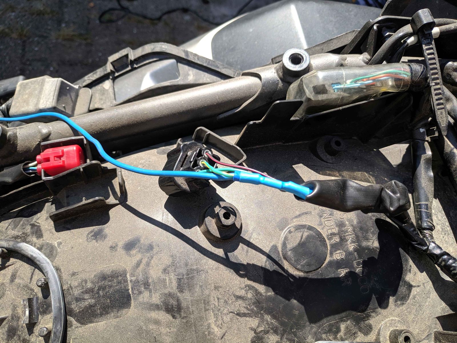 Das zweite „Problem“ war (wenn man es denn so nennen will), dass der Tempomat ein 12v Bremssignal braucht, damit er ausgeht, sobald man die Bremse betätigt. Die original Einbauanleitung beschreibt einen Abgriff von einem Stecker, der dort auch am Hauptkabelbaum ist. Aber dieser ist bei der DCT Variante hinter den anderen Steckern und sehr schlecht zugänglich. Die aus meiner Sicht viel einfachere Variante war das 12v Signal einfach hinten am Bremslicht abzugreifen, dafür musste der Soziussitz runter und die Topcase Halterung. Aber alles kein Hexenwerk. Wenn man es erst einmal gemacht hat, geht der Zusammenbau umso schneller.