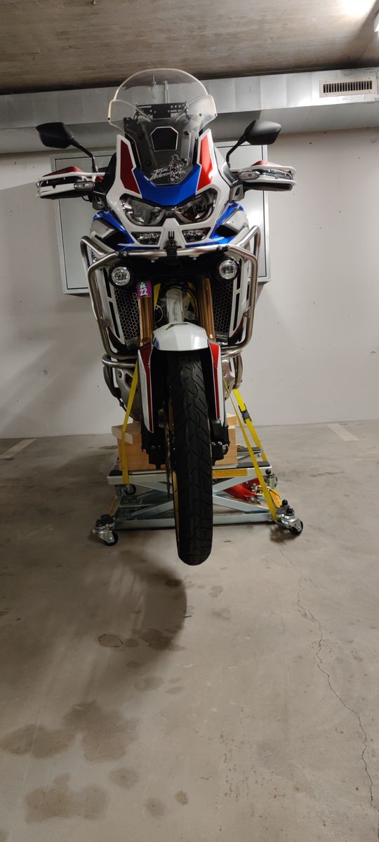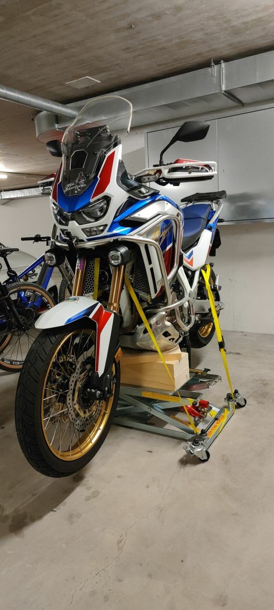 Ich verkaufe daher dieses Teil zusammen mit einem halben Kubikmeter Holzklötzen zum Unterlegen und dem Adapter für Motorräder mit Hauptständer siehe Fotos