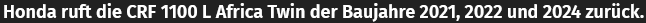 Honda ruft die CRF 1100 L Africa Twin der Baujahre 2021, 2022 und 2024 zurück. Grund ist die fehlerhafte Software der Traktionskontrolle.