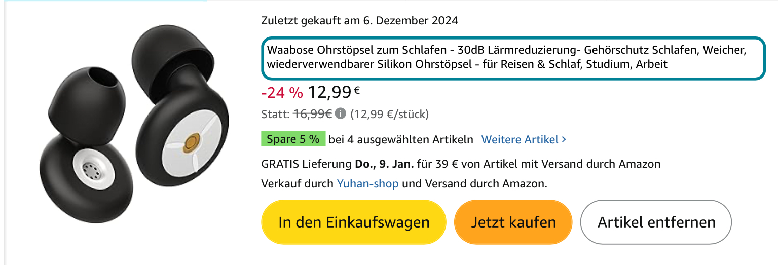 Ich bekomme immer wieder Werbung eingespielt von Lärmschutzstöpseln, die etwas anders gemacht sind als die, die man schon kennt. Jetzt habe ich mir die hier bei Amazon gekauft: