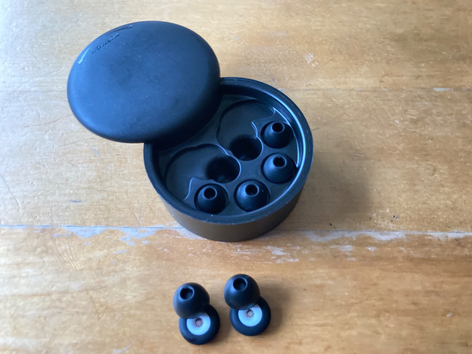 Die Box bietet Platz für die zwei Ohrstöpsel - und für zwei Paar Silikonpolster in anderen Größen. Ist natürlich irgendwie albern, denn sobald man ausprobiert hat, welche Polstergröße man braucht, kann man die anderen im Grunde wegschmeißen. Man muss sie auf jeden Fall nicht immer in einer Bereitschaftsbox dabei haben.