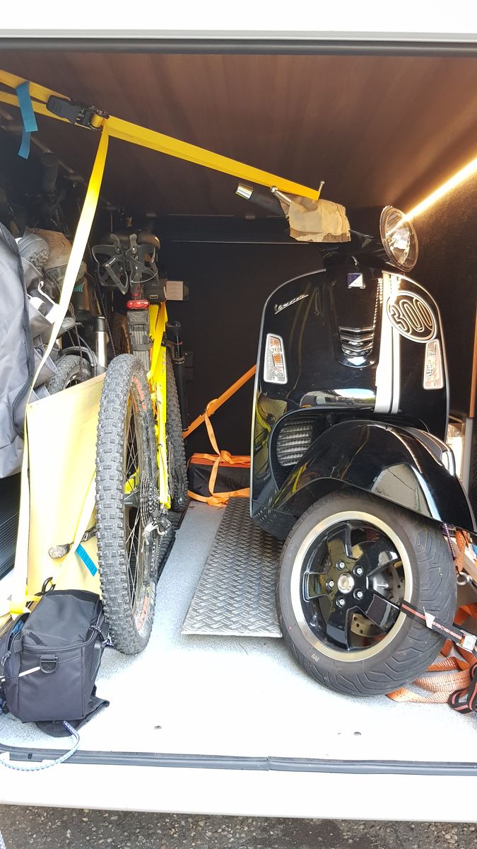 Ich plane, meine ATAS künftig im Womo in der Heckgarage mitzunehmen. Bisher hatten wir eine 300er-Vespa mit, die ATAS mitzunehmen, ohne einen Anhänger mitschleppen zu müssen, hätte aber seinen Reiz.