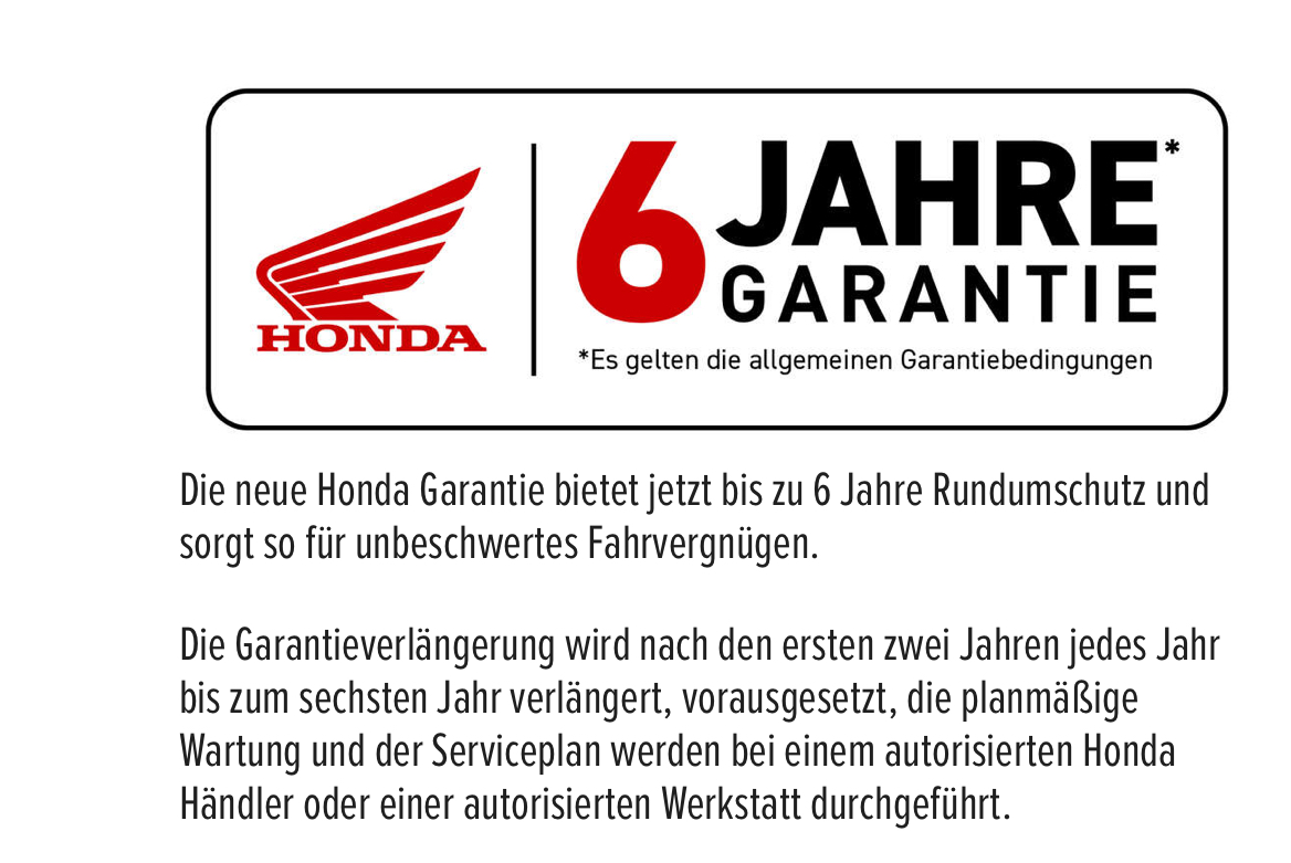 Motorradfahren macht noch mehr Spaß, wenn man ganz entspannt unterwegs sein kann. Deshalb bieten wir ab sofort bis zu 6 Jahre Rundumschutz. Sie gilt für all unsere Bikes und Roller mit Straßenzulassung und verlängert die zweijährige Gewährleistung automatisch um jeweils weitere 12 Monate. Sie müssen dafür nur den vorgeschriebenen Wartungsplan einhalten und die Inspektionen bei einem autorisierten Honda…