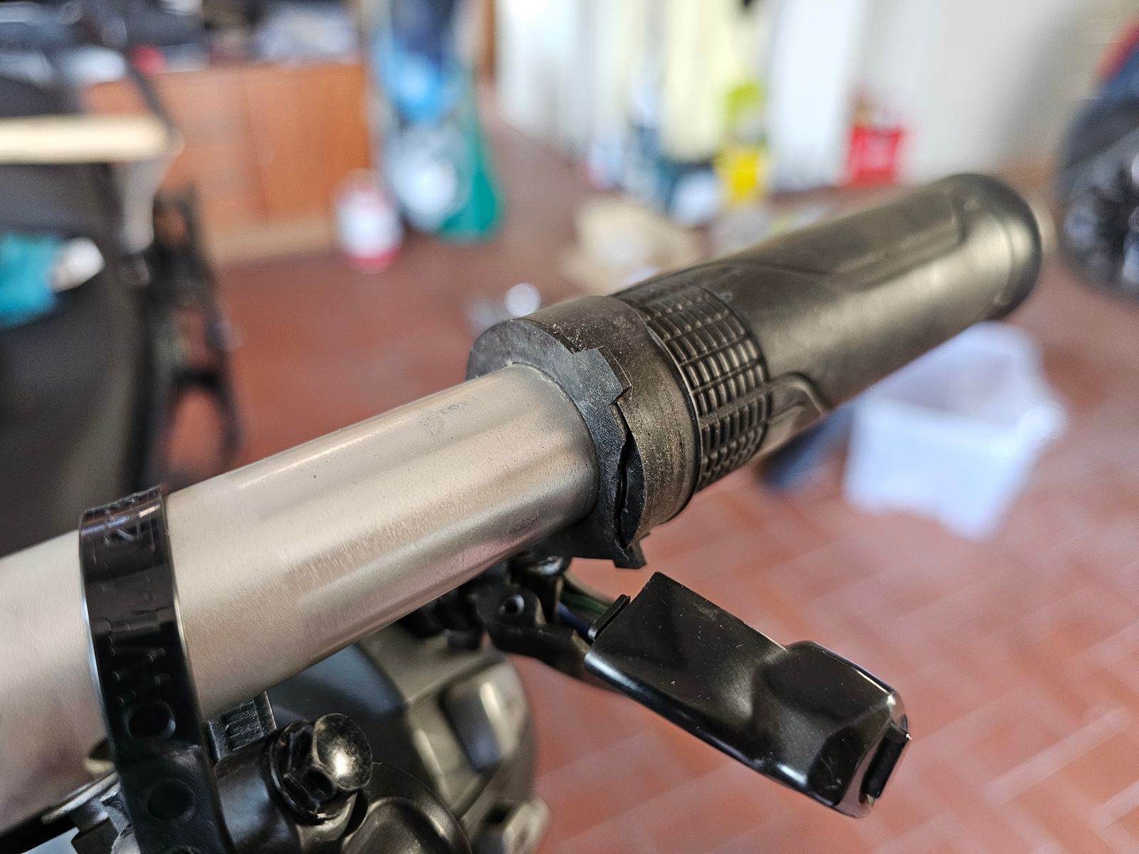 Ich bin gerade in einer Sackgasse. Fußrastenträger rechts ist getauscht (Update folgt im entsprechenden Beitrag) und ich habe versucht, den Lenker in seiner Gummilagerung zu "entspannen", er verschiebt sich aber in der Fahrt doch wieder in die krumme Position. Scheinbar ist also wirklich der Lenker verbogen. Ich habe einen Tauschlenker hier und bin gerade dabei, alles abzunehmen. Aber der originale Honda beheizte linke Griff wird gemäß originaler Anleitung mit "pro Honda Handgrip Cement" Auf dem Lenker verklebt und bewegt sich keinen Millimeter. Bekommt man den Griff jetzt irgendwie wiederverwendbar wieder runter? Ich habe versucht, entlang dem Umfang mit sanften Schlägen mit einem Gummihammer und Stiftdurchtreiber den Kleber zu lösen und den Griff runter zu bekommen aber bisher ohne Erfolg. Jetzt ist ein kleines Stück unwichtiges Plastik weg gebrochen. Funktioniert alles noch, aber bevor ich weiter prügel und noch mehr kaputt mache, wollte ich mal die Schwarmintelligenz fragen.
