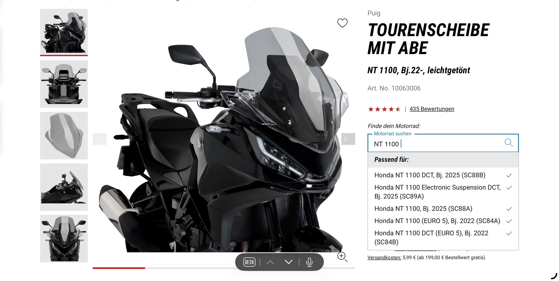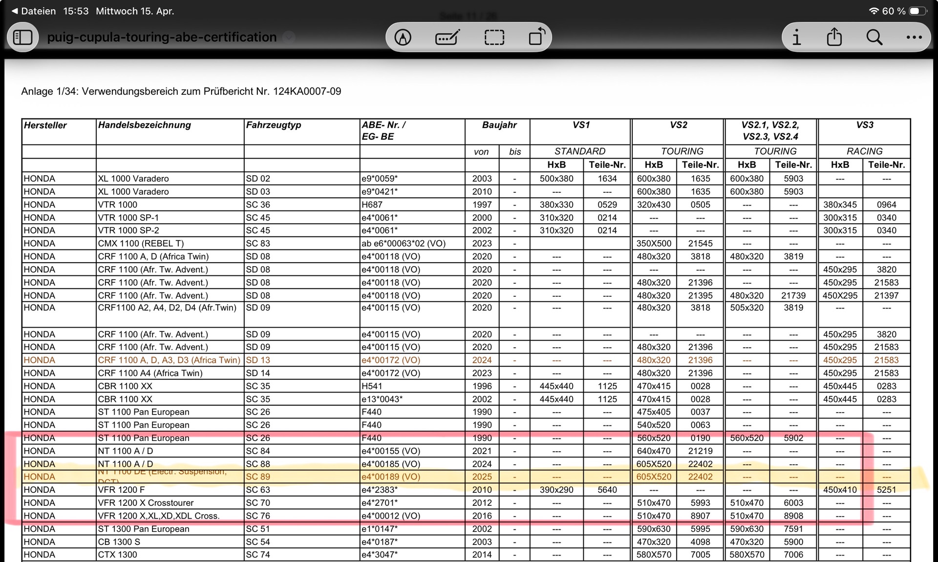 Hurra, Endlich ist eine ABE für die Tourenscheibe, für die NT 1100 2025 SC89 da. Nach dem vor ein paar Tagen der YouTuber „ DK6MP‘ s Adventure (Motorradreisen)“ offensichtlich die erste Freigabe von Puig bekommen hat, gibt es sie nun auch in der ABE, die man runterladen kann