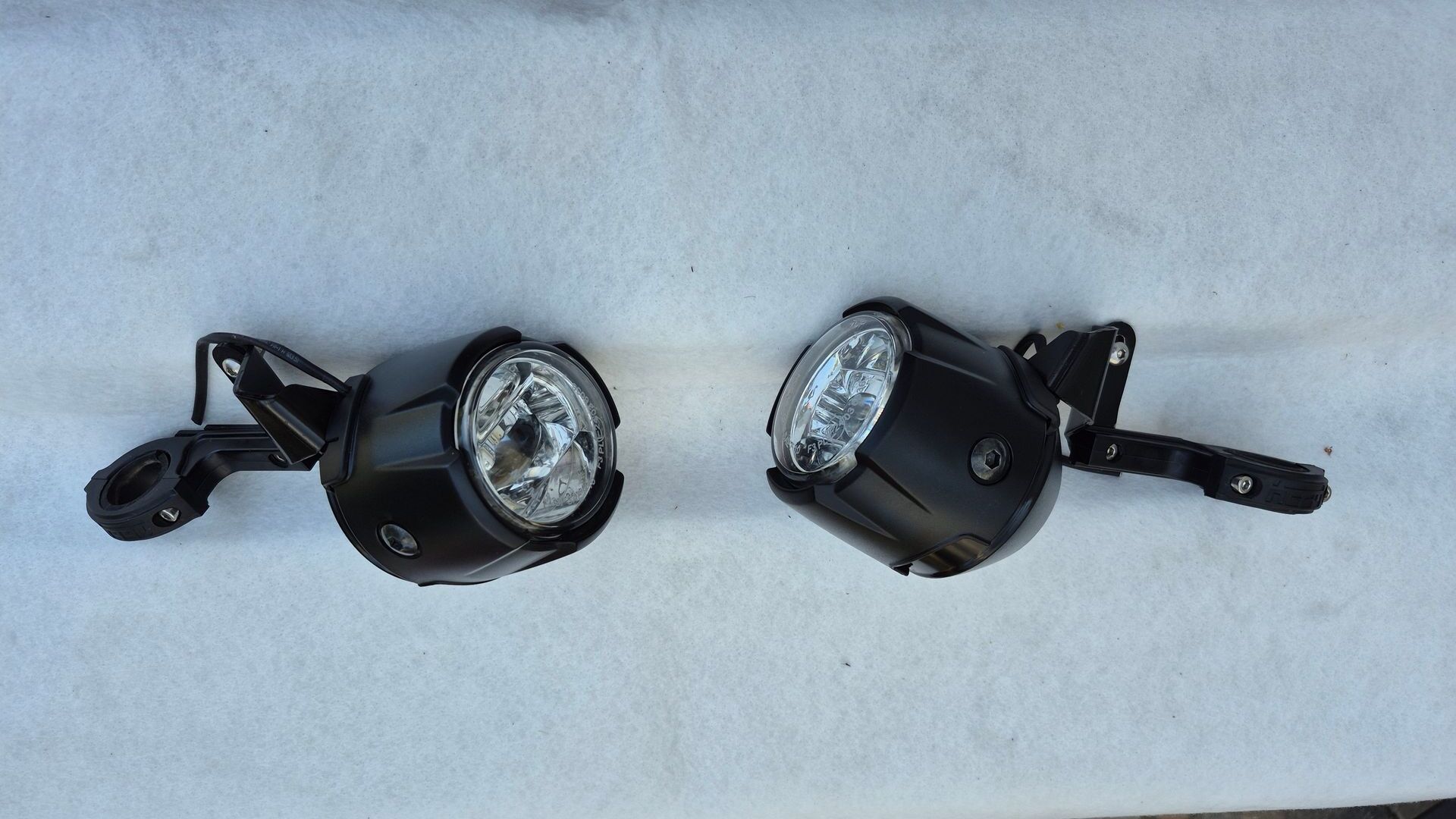 Hier noch ein Foto der originalen Honda Zusatzscheinwerfer. Die Kabel sind abgeschnitten. Dazu gibt es Halterungen von Heed für die universelle Montage an Schutzbügeln
