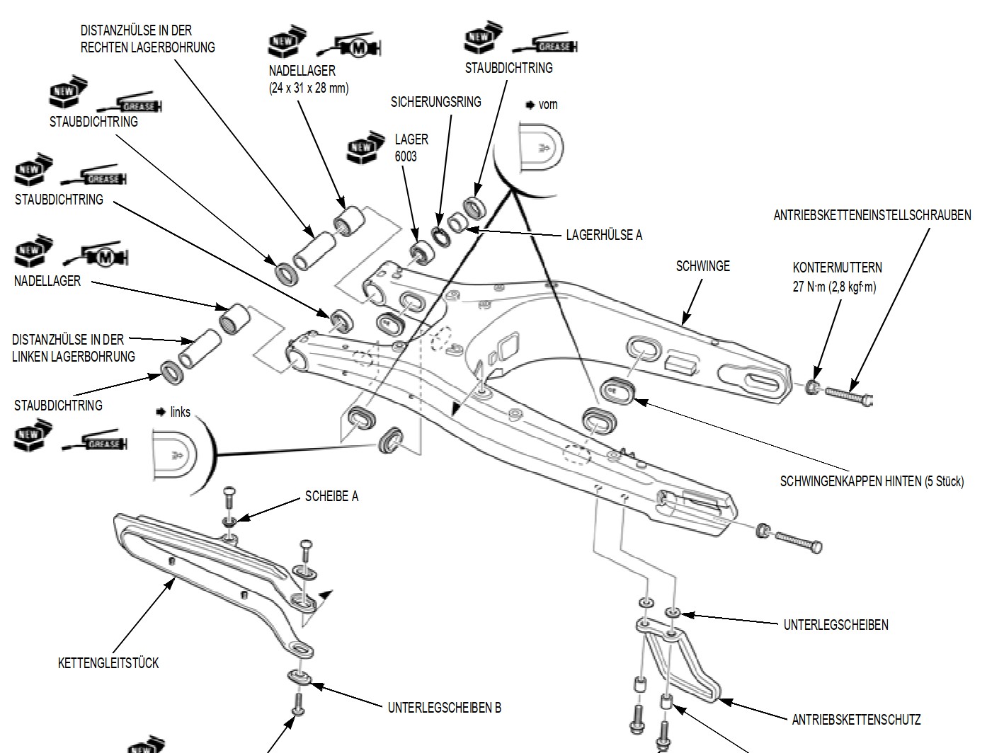 Wenn du wieder zu Hause bist, Schwinge austauschen und dabei gleich die Lagerung der Federungsaufhängung zerlegen und schmieren