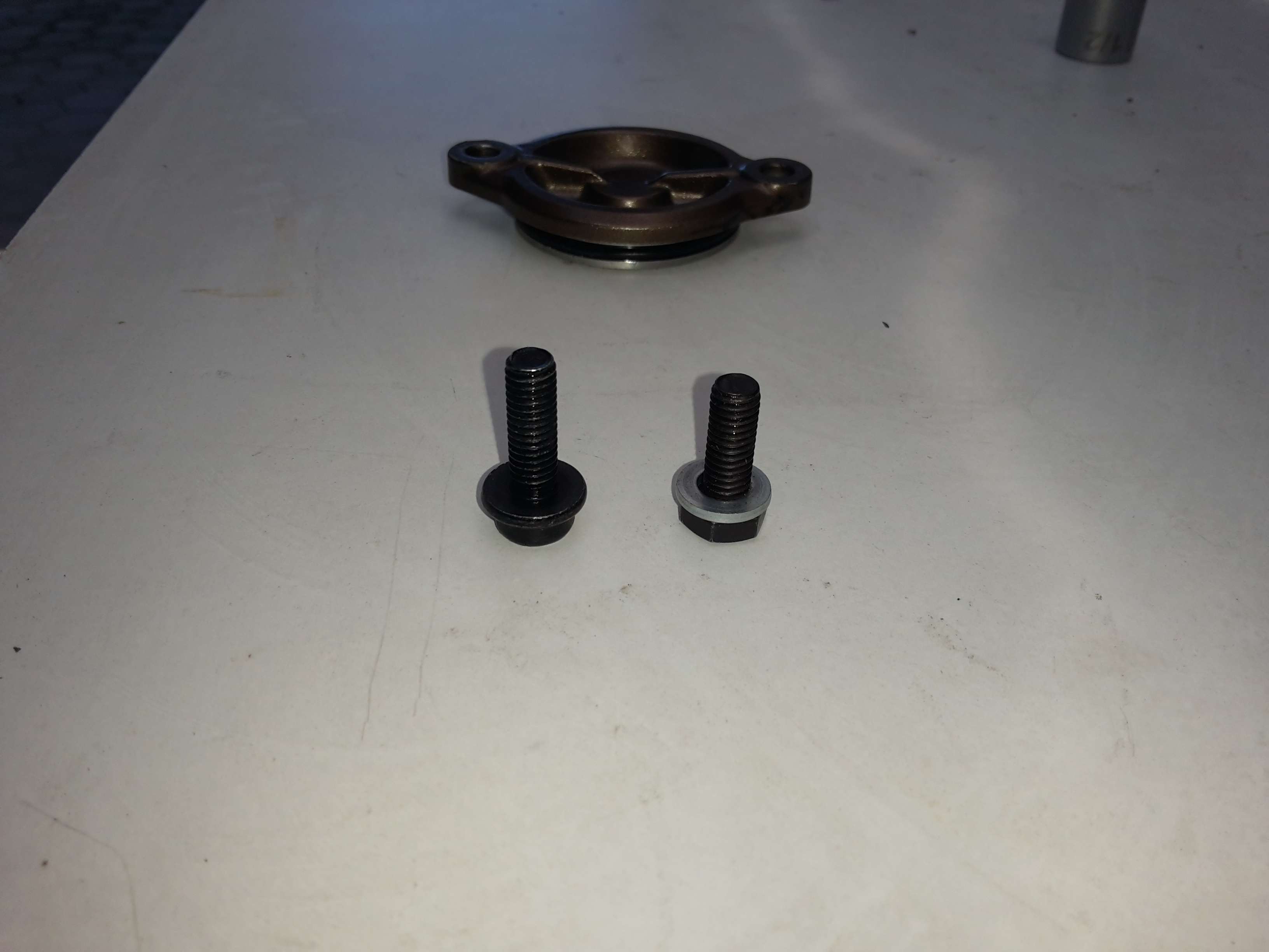 Für die die es evtl. noch nicht wissen: Wen der Bügel montiert ist bekommt man die hintere der beiden kleinen Deckelschrauben nicht heraus ohne den rechten Bügel zu lockern. Das ist besonders doof, da mit dem Bügel auch der Motor am Rahmen festgemacht ist und die selbstsichernden Muttern eigentlich gewechselt werden müssten. Insgesamt eine Sch...arbeit.