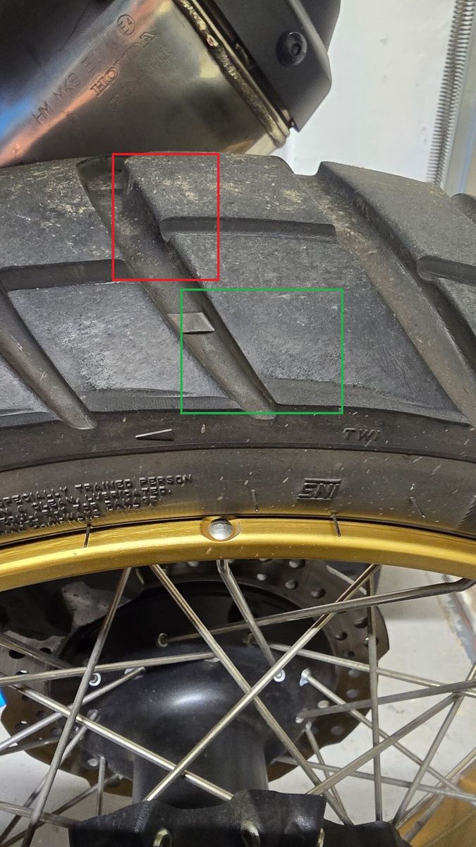 ich bin völliger Neuling im Bereich der Reiseenduros. 😃 Bin zuletzt eine Tuono V4 gefahren und möchte jetzt etwas kürzer treten und die Welt erkunden. Ich komme aus dem schönen Harz und habe die schönsten Straßen direkt vor der Haustür. Ich habe die ATAS mit 2600km gebraucht gekauft und habe nun bereits erfolgreich 2000km drauf gespult. Heute Abend ist mir beim Kette fettem aufgefallen, dass das verschleißbild auf der Flanke des Hinterreifens nicht besonders hübsch aussieht.