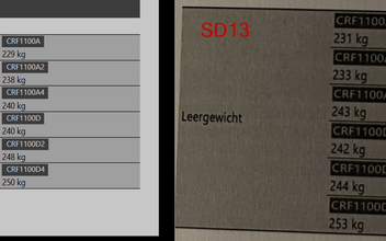 nach dem Screenshots aus den zwei Handbüchern ist die SD13 als CRF1100A im Leergewicht 2 kg schwerer als die SD08 geworden. und auch die CRF1100D ist 2 kg schwerer. Hier mal die Listen nebeneinander.