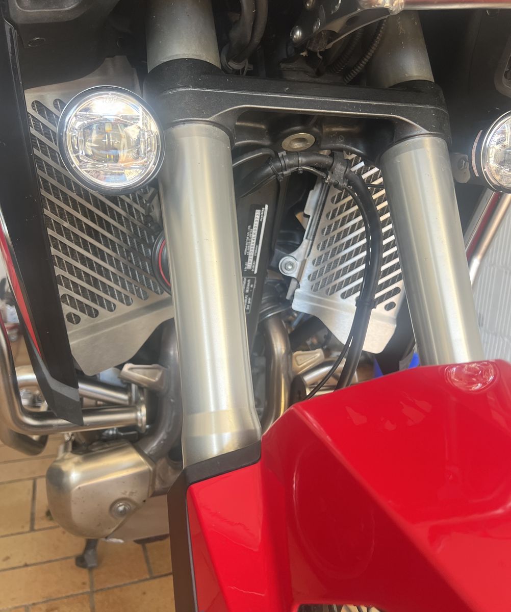 Ich verkaufe eine gut erhaltene Kühlerabdeckung aus geschliffenem Edelstahl für die Honda CRF 1100 Africa Twin SD08, Baujahr 2020 bis 2023.