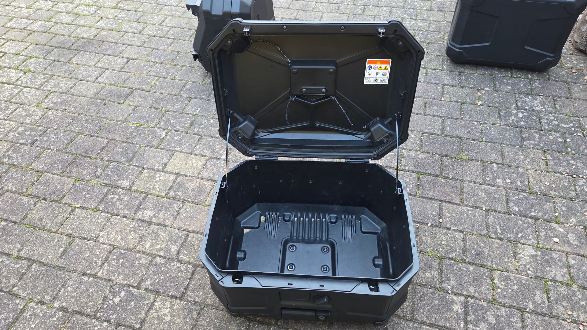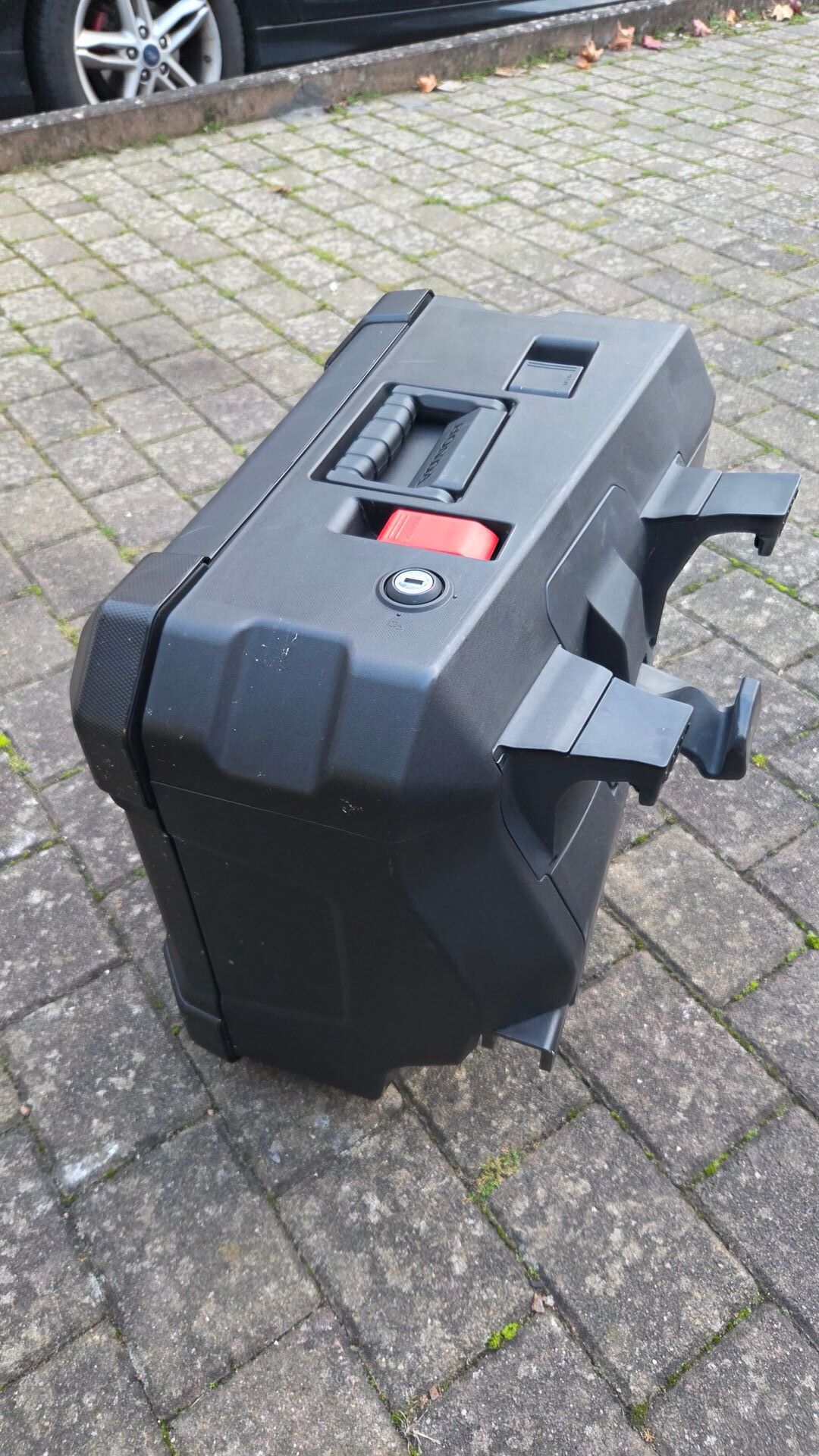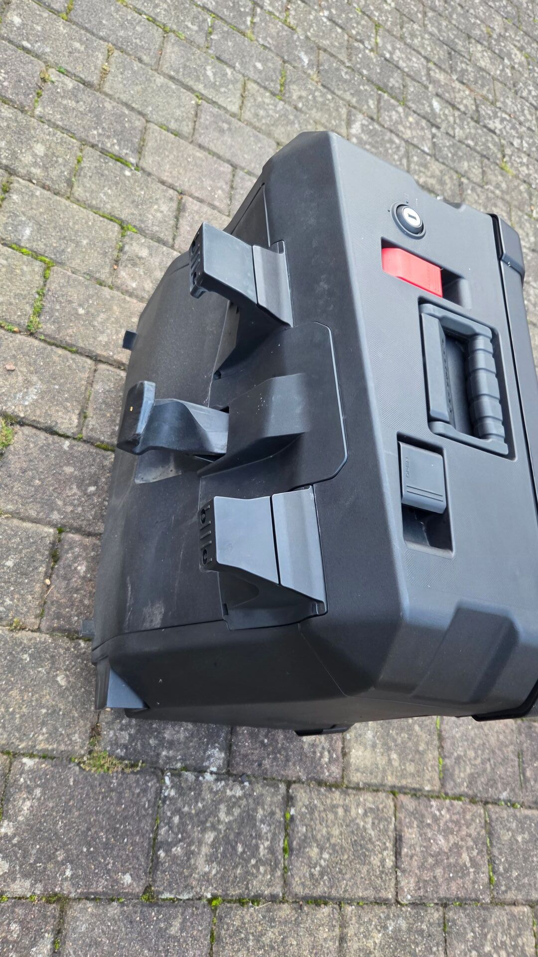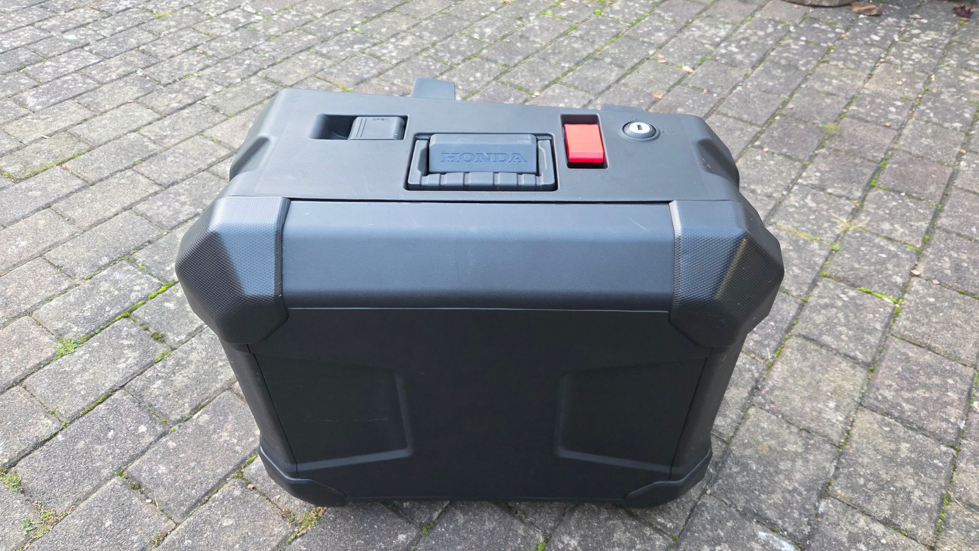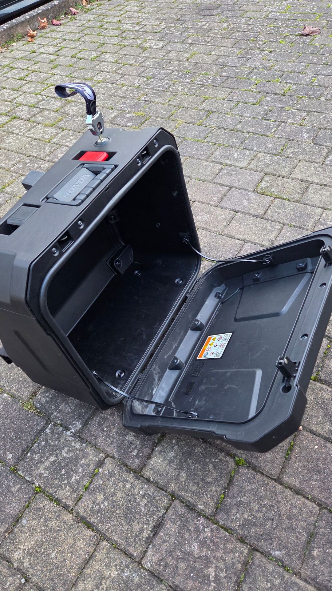 Ebenfalls dabei ist das original Honda TopCase 56 Liter. Das hat etwas mehr Gebrauchsspuren. Paar Kratzer un der Deckel hat von innen ein Riss der mit 2 Komponenten Kleber repariert ist.