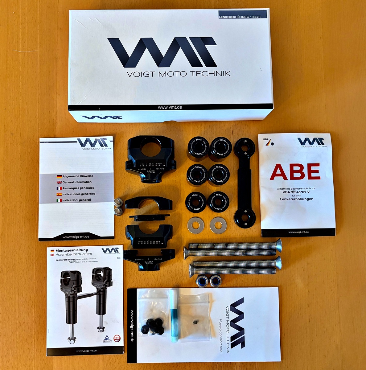 Noch zur Info: es gab' eine Rückrufaktion für 2 Bauteile. Diese ist erledigt, beim Kauf sind die "zu verwerfenden" Teile mit dabei, das Bestätigungsschreiben natürlich auch. Die 2 langen M10 Schrauben sind gekürzt um die OEM-Höhe. Wer maximal hoch will muss sich diese 2 Schrauben nach organisieren. Alles kommt im Originalkarton inkl. Dokumentation und ABE und ohne Beschädigung oder Mängel.