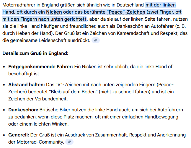 Da der entgegenkommende Fahrer ja auf der rechten Seite entgegenkommt, müsste man ja mit der rechten Hand grüßen, damit er den Gruß sieht. Dafür müsste man aber den Gasgriff loslassen???
