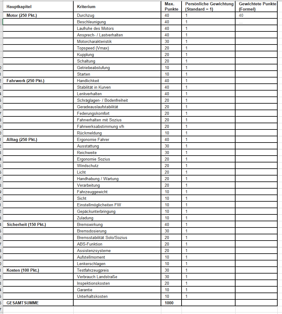 Da die Zeitschrift MOTORRAD meist den Quotienten aus Preis pro Punkt nutzt, kannst du folgende Logik in Excel anwenden: