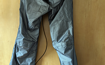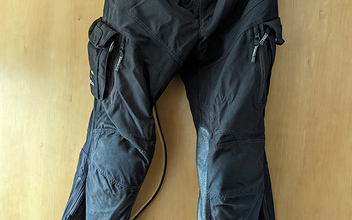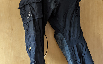 Der Anzug befindet sich in gutem, gepflegtem und getragenem Zustand. Keine Stürze, keine Beschädigungen, alle Reißverschlüsse funktionieren einwandfrei. An der Hose verliert der Ledereinsatz an der Innenseite etwas die Farbe. An den Schienbeinen habe ich vom Sattler Lederverstärkungen anbringen lassen. Leichter Abrieb am Saum der Innenjacke.
