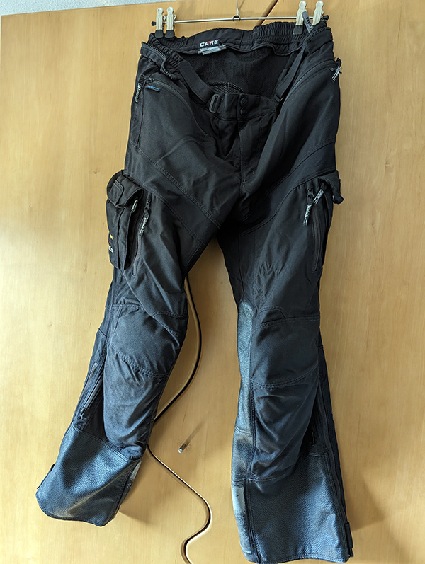 Der Anzug befindet sich in gutem, gepflegtem und getragenem Zustand. Keine Stürze, keine Beschädigungen, alle Reißverschlüsse funktionieren einwandfrei. An der Hose verliert der Ledereinsatz an der Innenseite etwas die Farbe. An den Schienbeinen habe ich vom Sattler Lederverstärkungen anbringen lassen. Leichter Abrieb am Saum der Innenjacke.