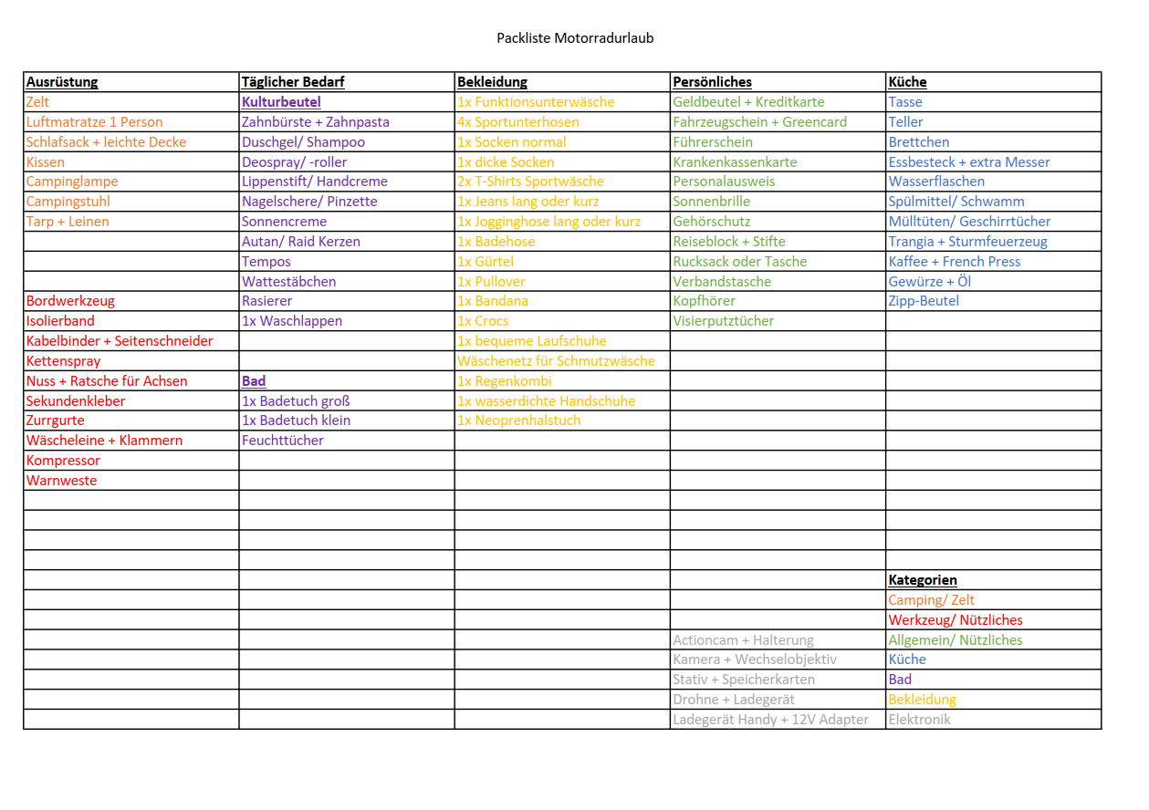 Hier meine Tabelle, was ich alles so beim Campen mit der AT dabei habe. Die Liste wurde die letzten Jahre immer mal wieder "optimiert" und auch für die Skandinavienreise 2025 mit dem Auto verwendet. Vielleicht hilft es dem ein oder anderen, oder aber es gibt Einsprüche, Ergänzungen oder ähnliches. Bin für jede Optimierung/ Ergänzung dankbar.