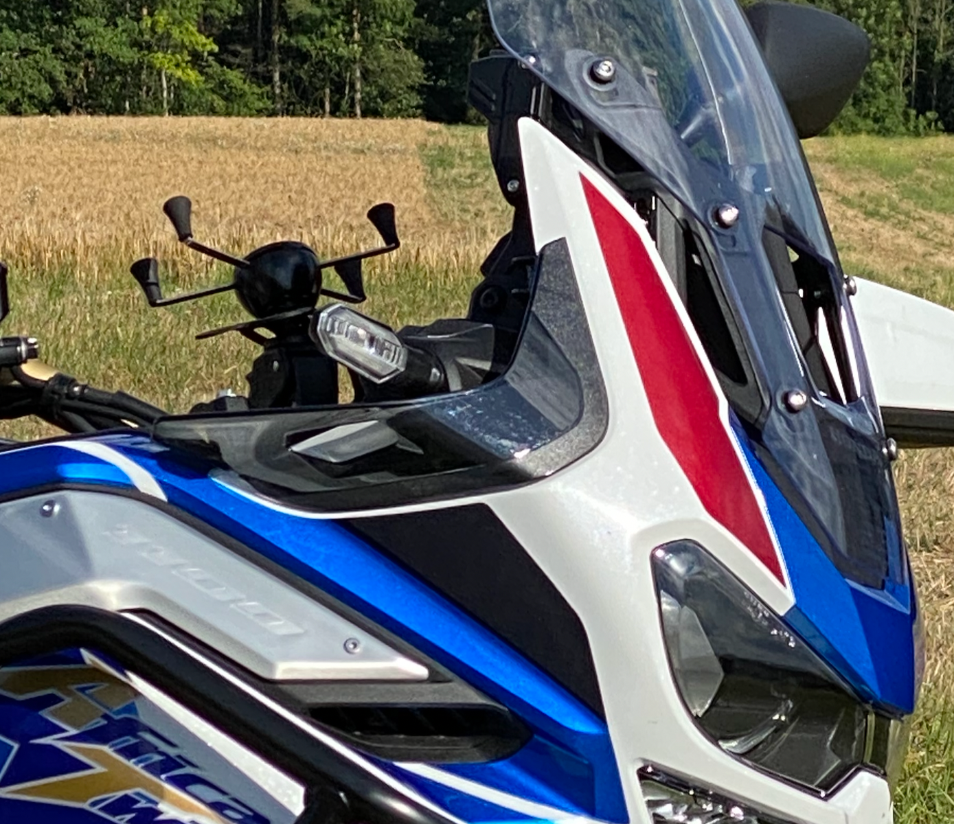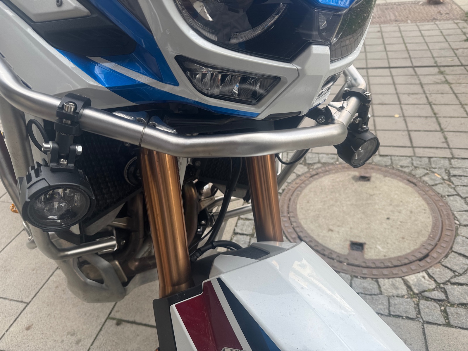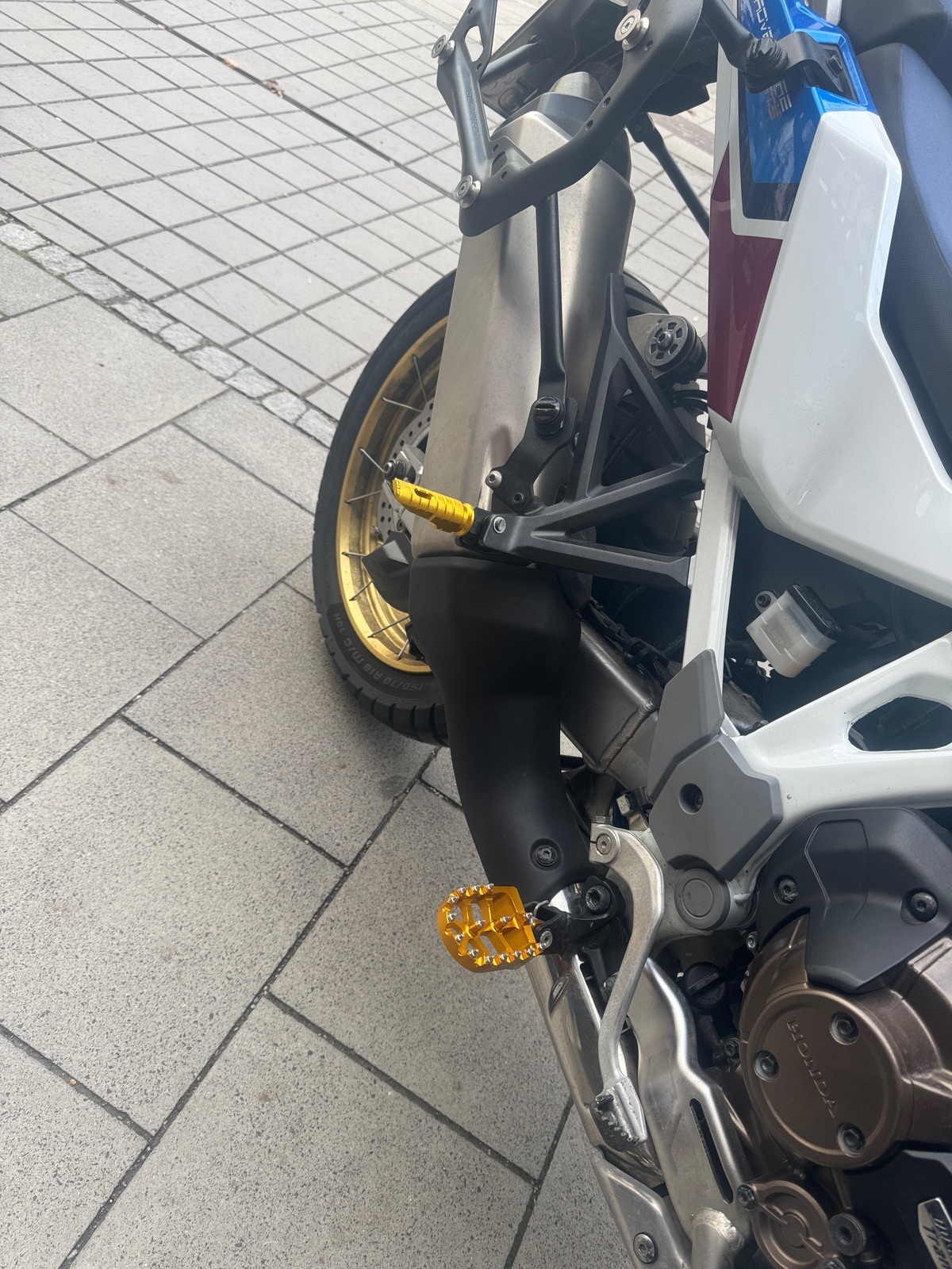Ich habe zusätzlich Teile gebaut: Fussstütze für Fahrer und Sozius in Goldfabe passt gut mit Felgen und Gabel, Zusatzscheinwefer dank Anleitung von Forum, Hauptständer, windstoppe oben und Gabelkanal, Kurze Windschild mit aufsatz Topcase 58 liter, aluseitenkoffer, Tankpass in tricolor, kabellos carplay. Jetzt fehlt noch schöne Wette.