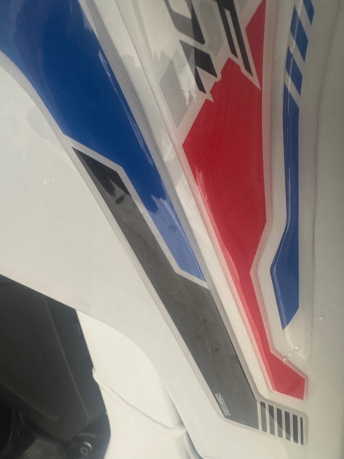 Lieferzustand ist das Motorrad auch schon ganz schön bunt, Weiß, Blau, Rot, und Gold.