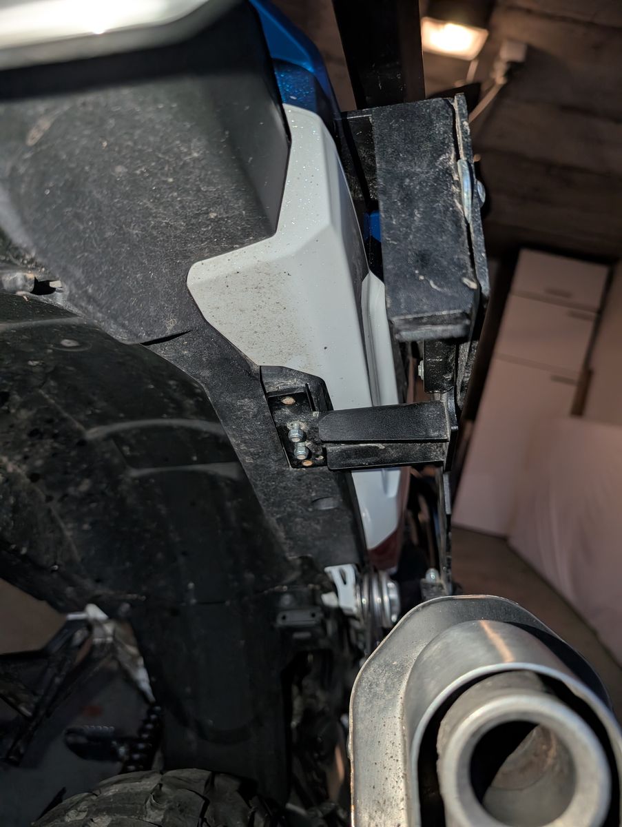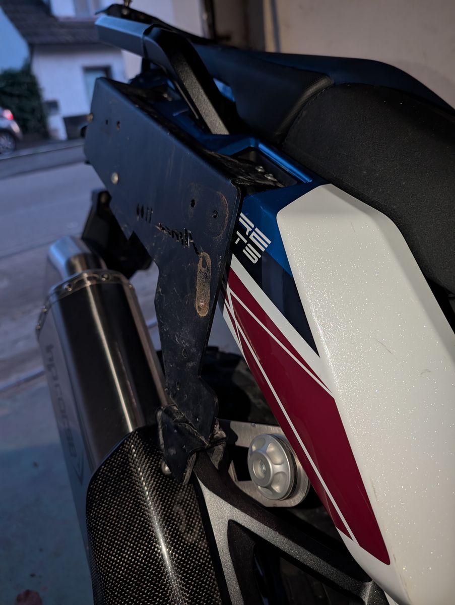 Kompakter und näher am Motorrad kann man das meiner Meinung nach gar nicht bauen. Der eigentlich klapp Mechanismus ist super simpel, einfach 2 Bleche die mit einer Schraube (nicht ganz fest geschraubt) als Achse verbunden werden.