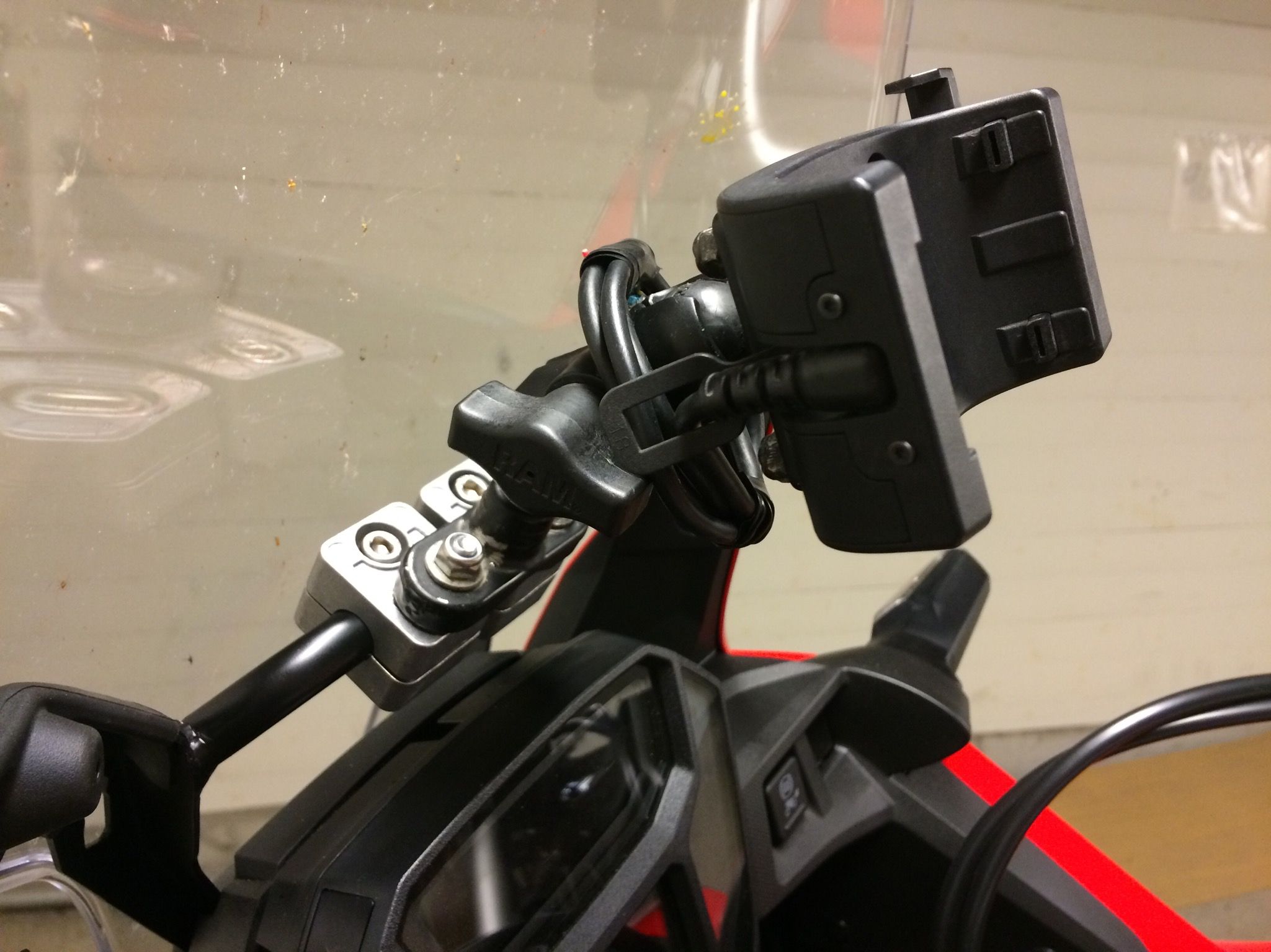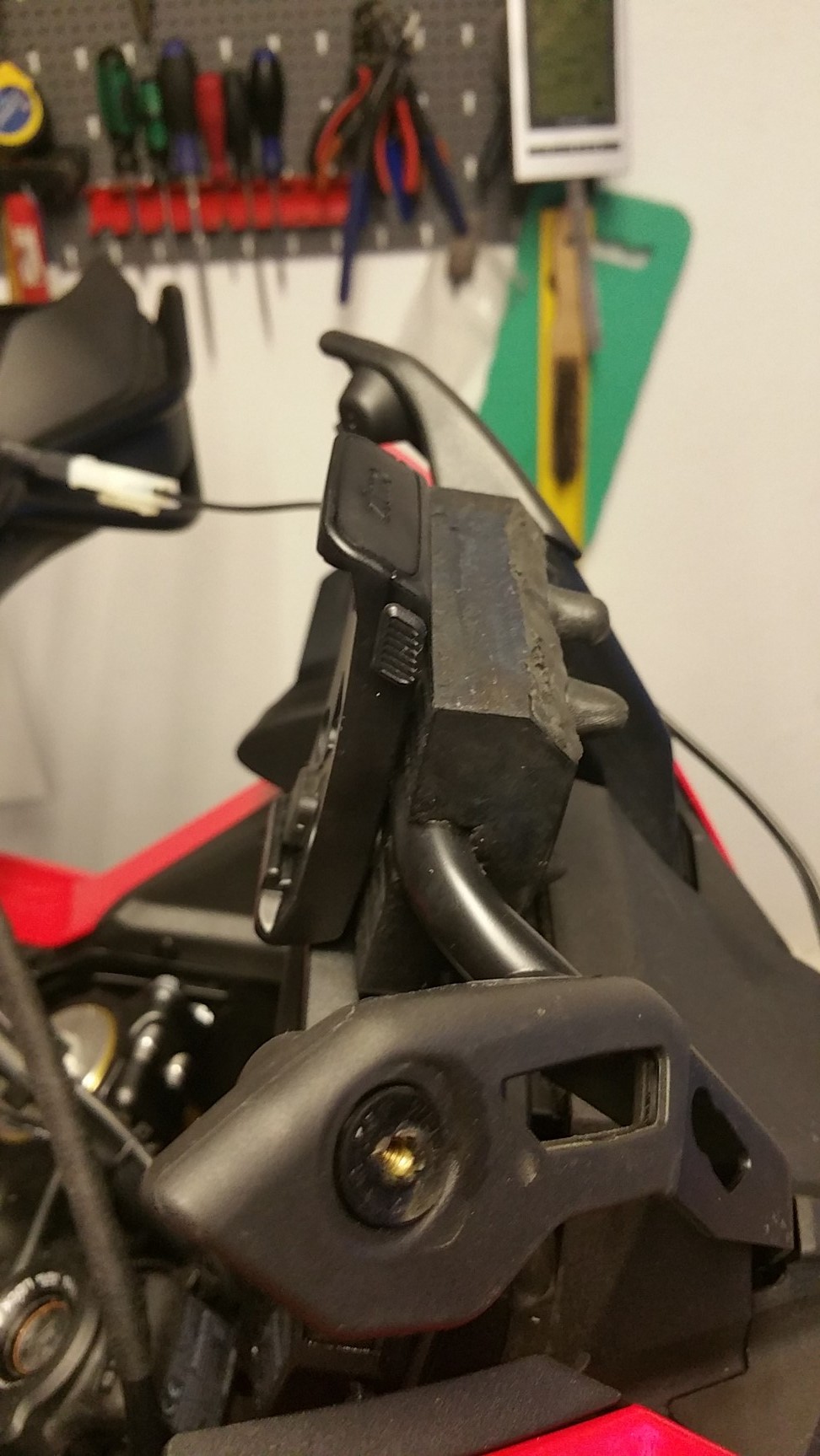 Damit lässt sich der Halter bombensicher am Querrohr hinter der Scheibe anschrauben, ohne das Rohr zu beschädigen. Das RAM System hat durch die Gummikugeln ne gewisse Vibrationsdämpfung. Stromanschluss fehlt noch, brauche noch den Stecker. Das GPS rückt damit ein gutes Stück näher zum Fahrer, so das ich es bequem bedienen kann, gleichzeitig kann es durch die Kugeln voll verstellt werden für sowohl sitzende als auch stehende Fahrposition. Materialkosten (vom RAM System mal abgesehen, dass noch in der Schublade lag) 12 Euro für Klemmblöcke und Schrauben! Pfeif' auf Touratech! ![]()