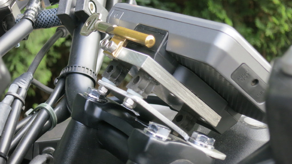 Man sollte dazu wissen , das das Garmin normalerweise mit dem "drücken " des Knopf rechts gelöst wird , und dabei oben am Halter der Garmin Riegel "rausgedrückt" wird , das Steckschloss verhindert das "rausdrücken" mit der kleinen Messingnase .