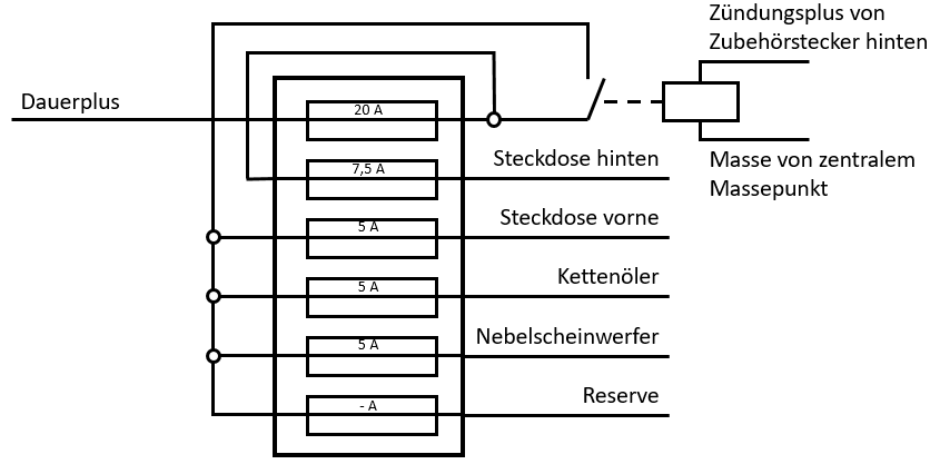 ich hole das nochmal hoch, da mir Fragen bleiben. Ich möchte nur geschaltetes Plus an einen zusätzlichen Sicherungskasten legen, um hier mal Nebelscheinwerfer, Kettenöler (und später ggf. Heizgriffe) zu versorgen.