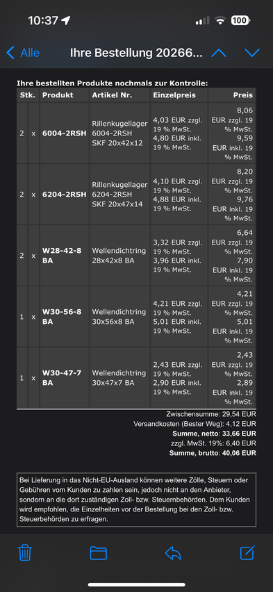 Ich hab die Lager mal bestellt, ich hoffe die kommen fix ...jetzt wo das Wetter mal passen würde...ärgerlich