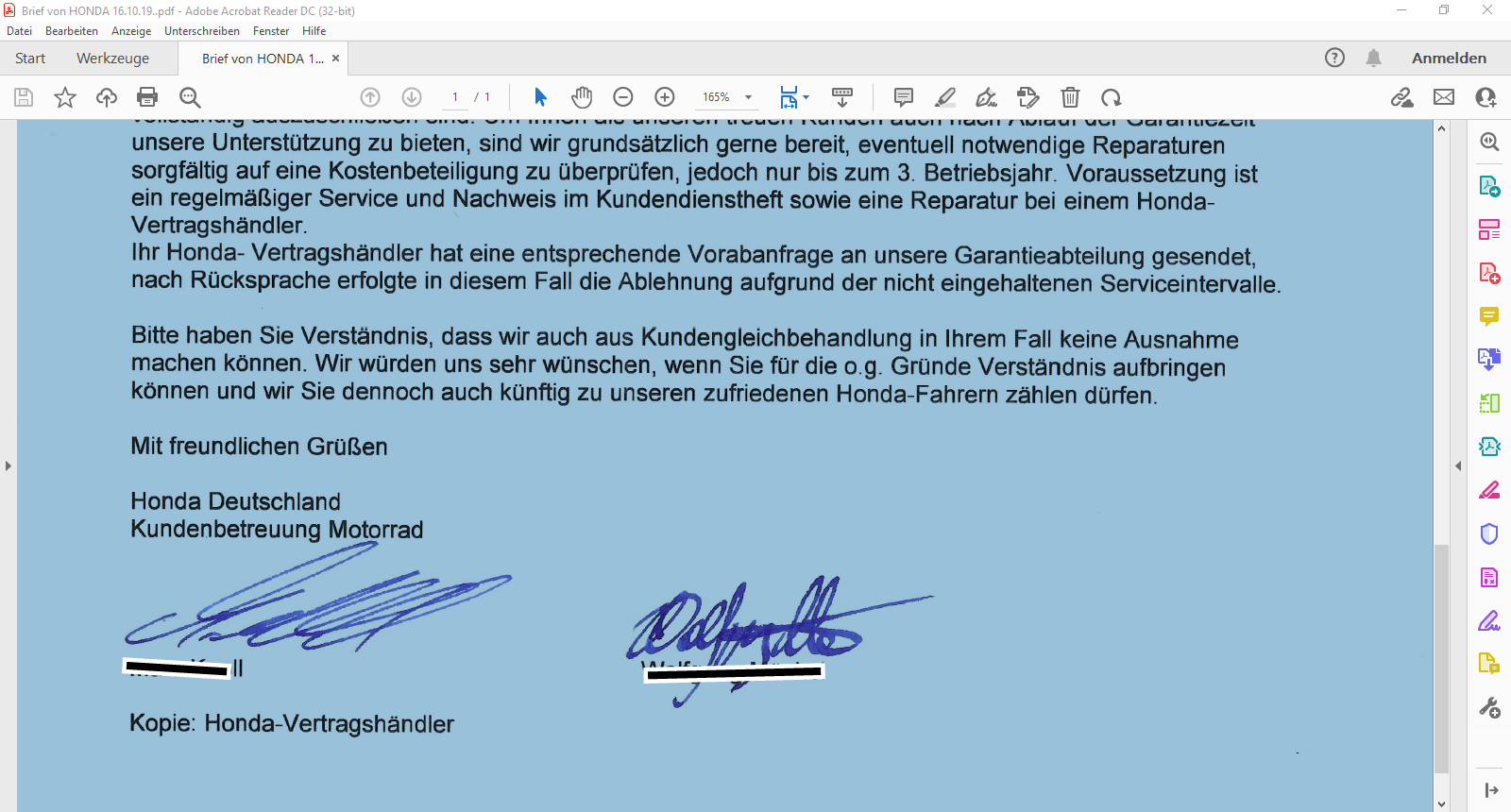 Ich habe auf das Schreiben von HONDA reagiert, ihnen eine Begründung meinerseits geschickt........keine Chance. Anbei das Schreiben von HONDA an mich!