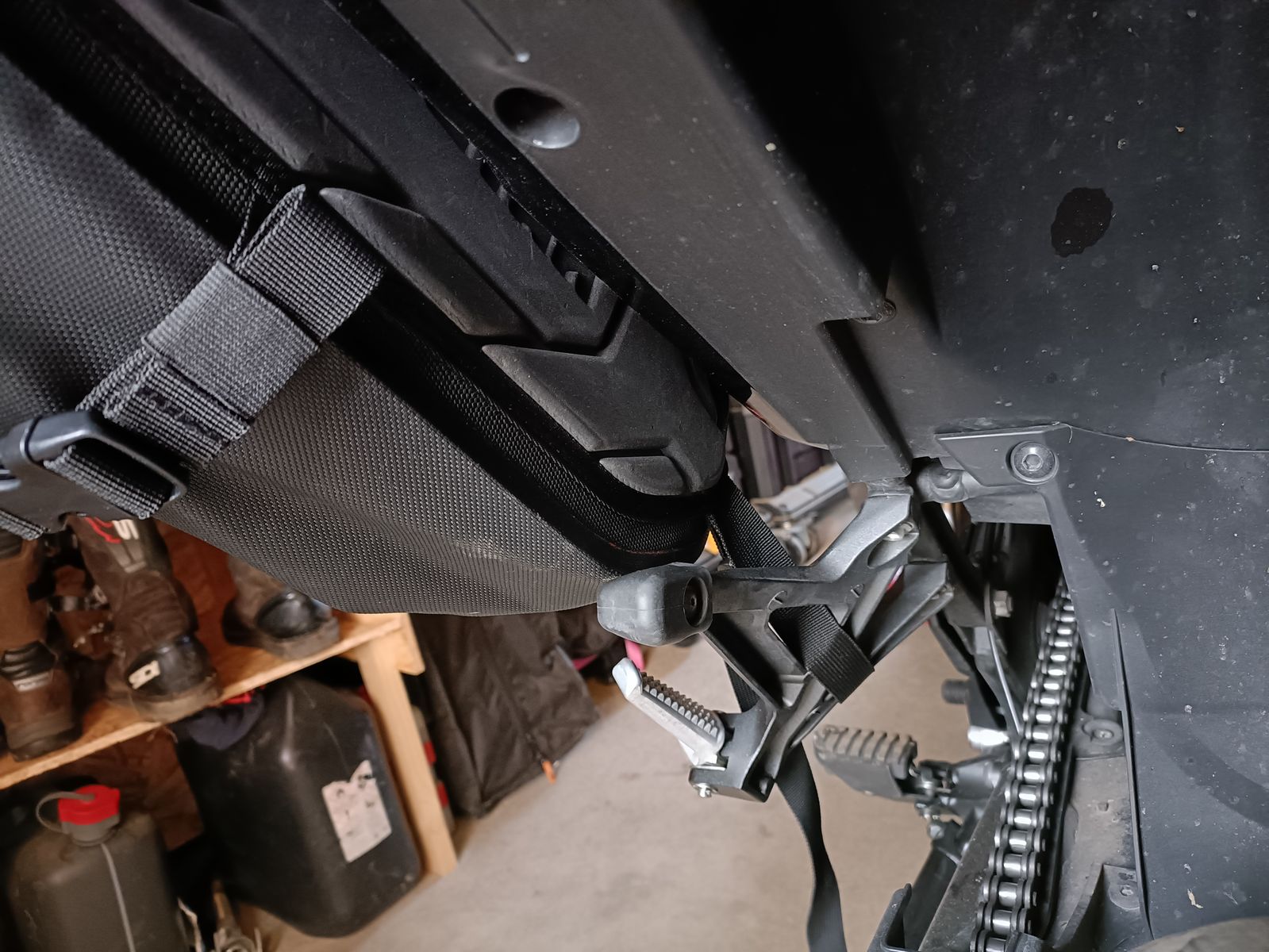 Und dann ... ich bin echt mittelschwer begeistert. Die Taschen passen super, liegen unten auf dem Dreieck von den Sozius-Fußrasten auf. Sieht alles sehr stabil aus. Un d das zweite Mal dranmachen geht innerhalb von Sekunden.