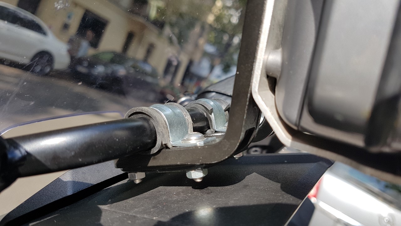 #130 Zur Montage am Spiegel war beim Rider Originalzubehör damals ein Winkel dabei, den ich nie gebraucht habe. Passt bei ATAS nun perfekt für den Anbau hinterm Windschild. Die Rohrschellen gibts im Bauhaus. Verdreht sich nix.