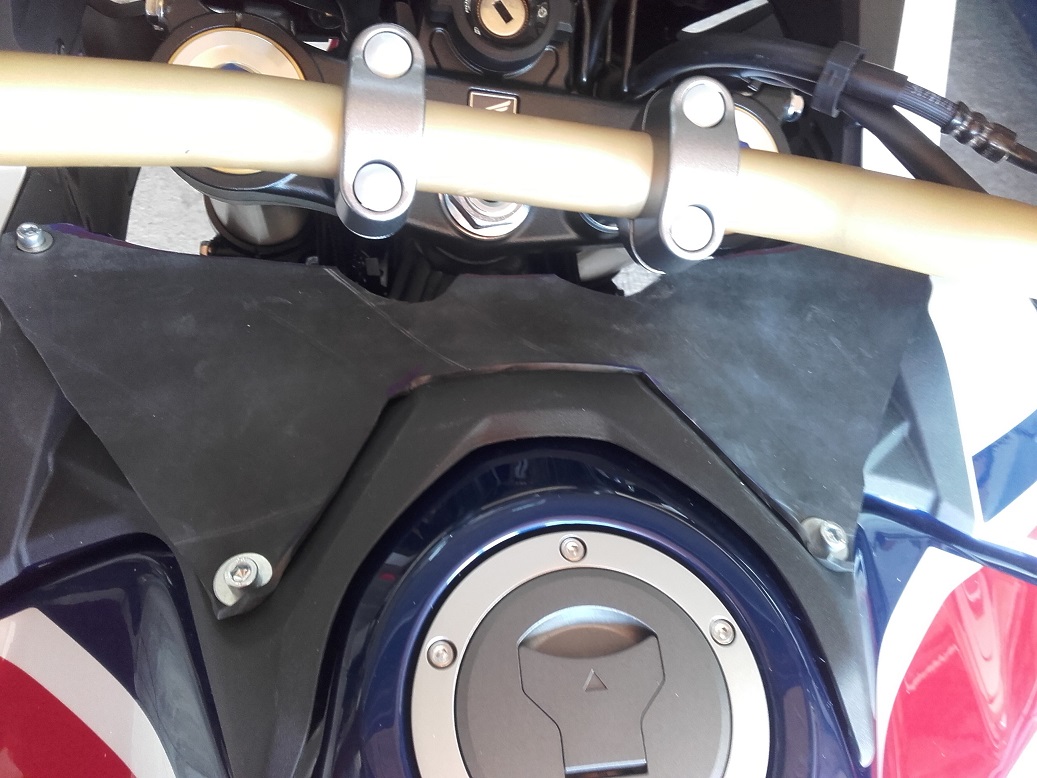 einzig ist das ich den Gummi etwas straffer machen muss, er wird bei flotter Fahrt etwas nach oben gezogen aber nicht schlimm D( Dabei sieht mann erst was für ein Luftstrom da hoch kommt ). Habe auch Aussparungen Lenker gemacht so ist Volleinschlag ohne Berührung möglich.jetzt geht es an den Feinschliff, Passform und andere Schrauben