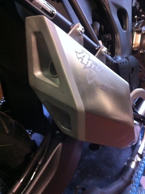 Die bunten Aufkleber auf dem Mattschwarz beißen sich total. Vorne neben der Scheibe war dann die schwarze Folie alle?Und warum lässt er sich den Schriftzug der alten Twin auf den gruseligen Auspuff lasern??