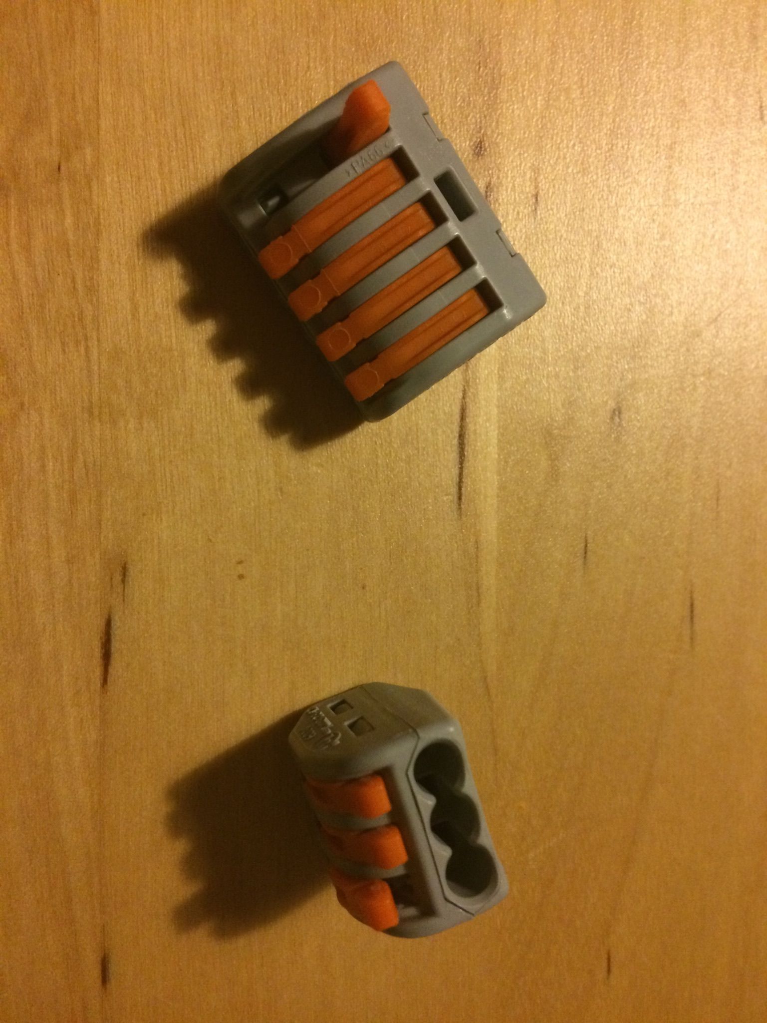 Ich habe neulich diese Klemmverbinder entdeckt, die es in verschiedenen Ausführugen gibt, hier mal mit drei und fünf Anschlüssen. Vorteil: die Verbindung ist einfach wieder lösbar. Nachteil: nicht wassergeschützt, aber wenn man ein trockenes Plätzchen unter der Verkleidung findet, was spricht dann dagegen? Die Dinger sind eigentlich für 230V Hausinstallationen gedacht. Jedes Kabel wird mit einer eigenen, lösbaren Klemmung gehalten, die über den kleine orangen Hebel betätigt wird.