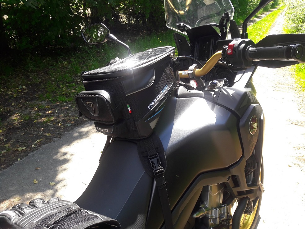 Passt eigentlich sehr gut, bis natürlich auf das Gefummel mit den Riemen beim Tanken.