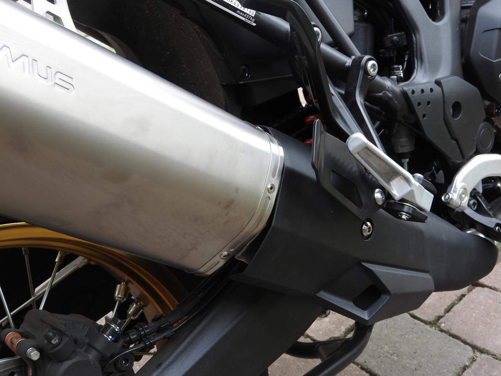 Wenn man über das Hitzeschutzblech wieder die original schwarze Plastikabdeckung macht, dann passt das aus meiner Sicht optisch nicht wirklich zum Remus ESD. Der Konturverlauf des Plastikteils zum ESD hin ist halt auf den Original-ESD angepasst. Dennoch dachte ich, dass der Remus sich hier besser ranfügt.