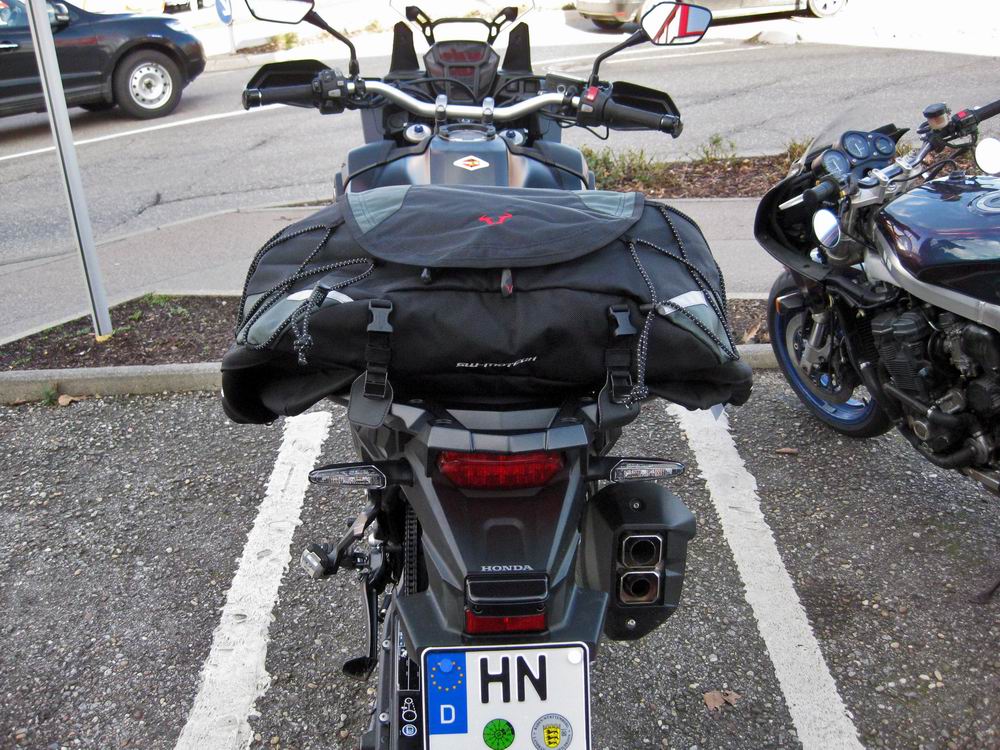 Die Tasche passt super auf den Soziussitz. Die seitlichen Überhänge der Tasche stützen sich gut auf den Soziusgriffen ab. Leider ist die Tasche etwas unförmig im ungefüllten Zustand. Habe schon meine Motorradjacke reingestopft, war aber immer noch zu wenig (logo, bei 50 Liter Volumen...).