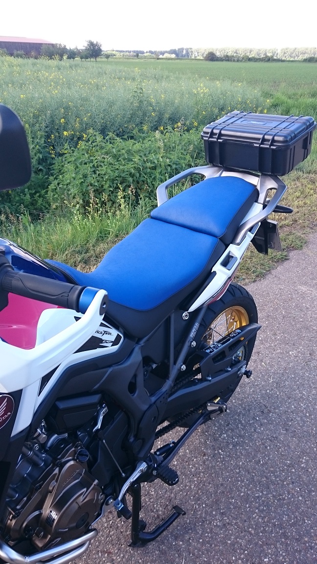 Weil ich das Topcase von BMW seit 10 Jahren auf meiner GS hatte und daran gewöhnt bin, es auch bei Bedarf vergrößern zu können, habe ich es einfach direkt mit M10-Schlossschrauben auf meine AT geschraubt.