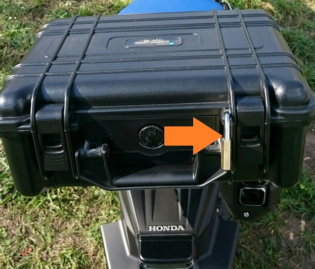 c) 10.000 KM als Top Case ca. 15-18 L mit einem kurzen Stahlkabel und Vorhangschloss "gesichert"