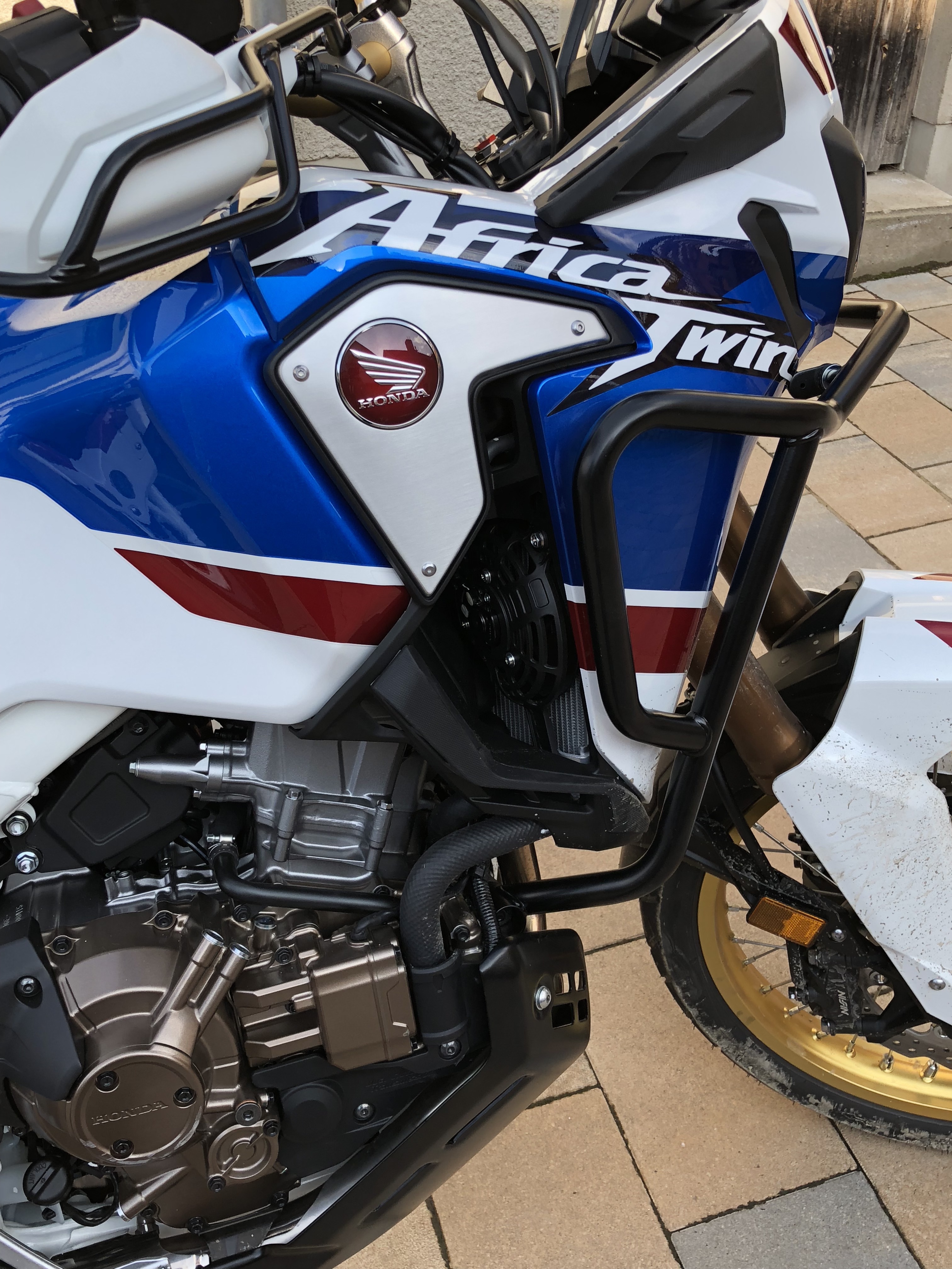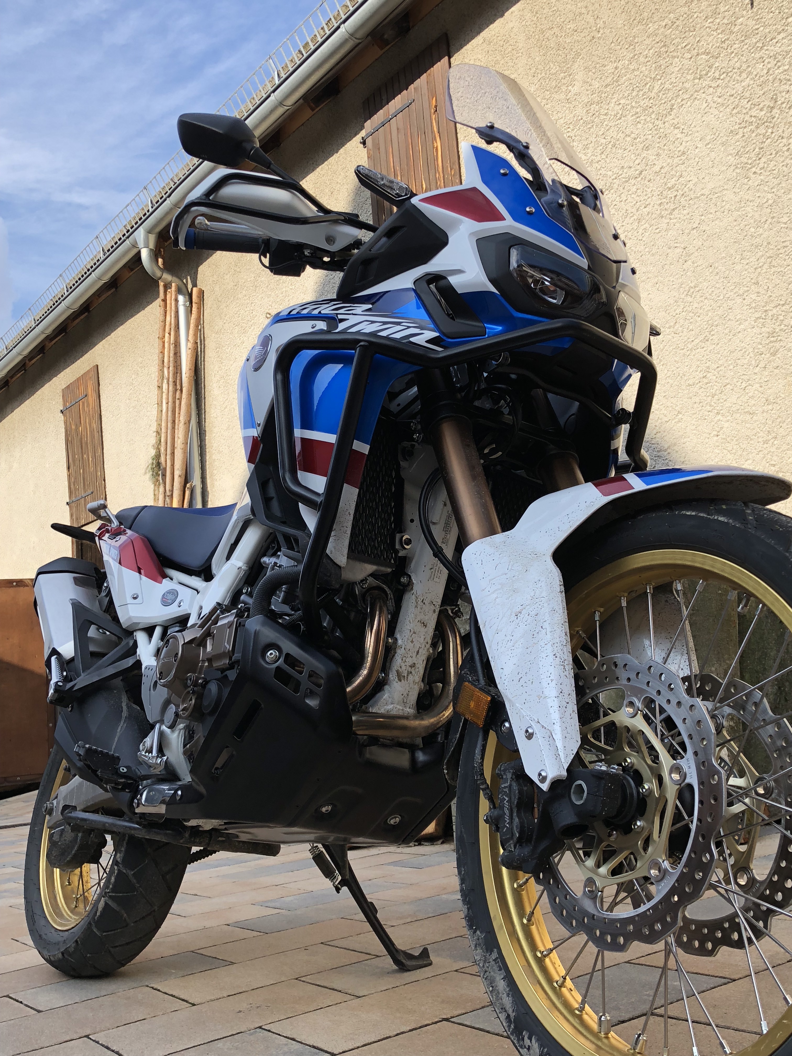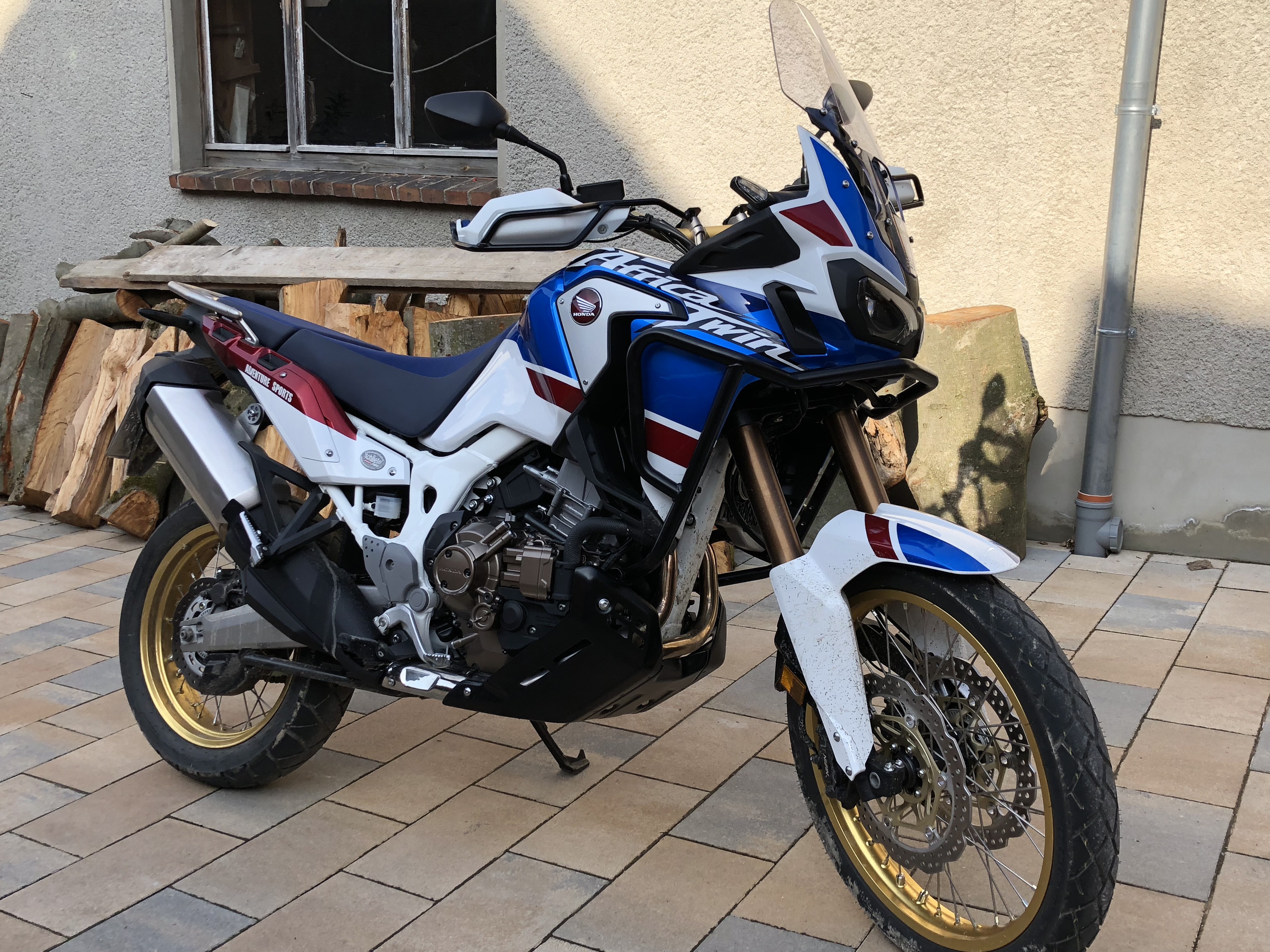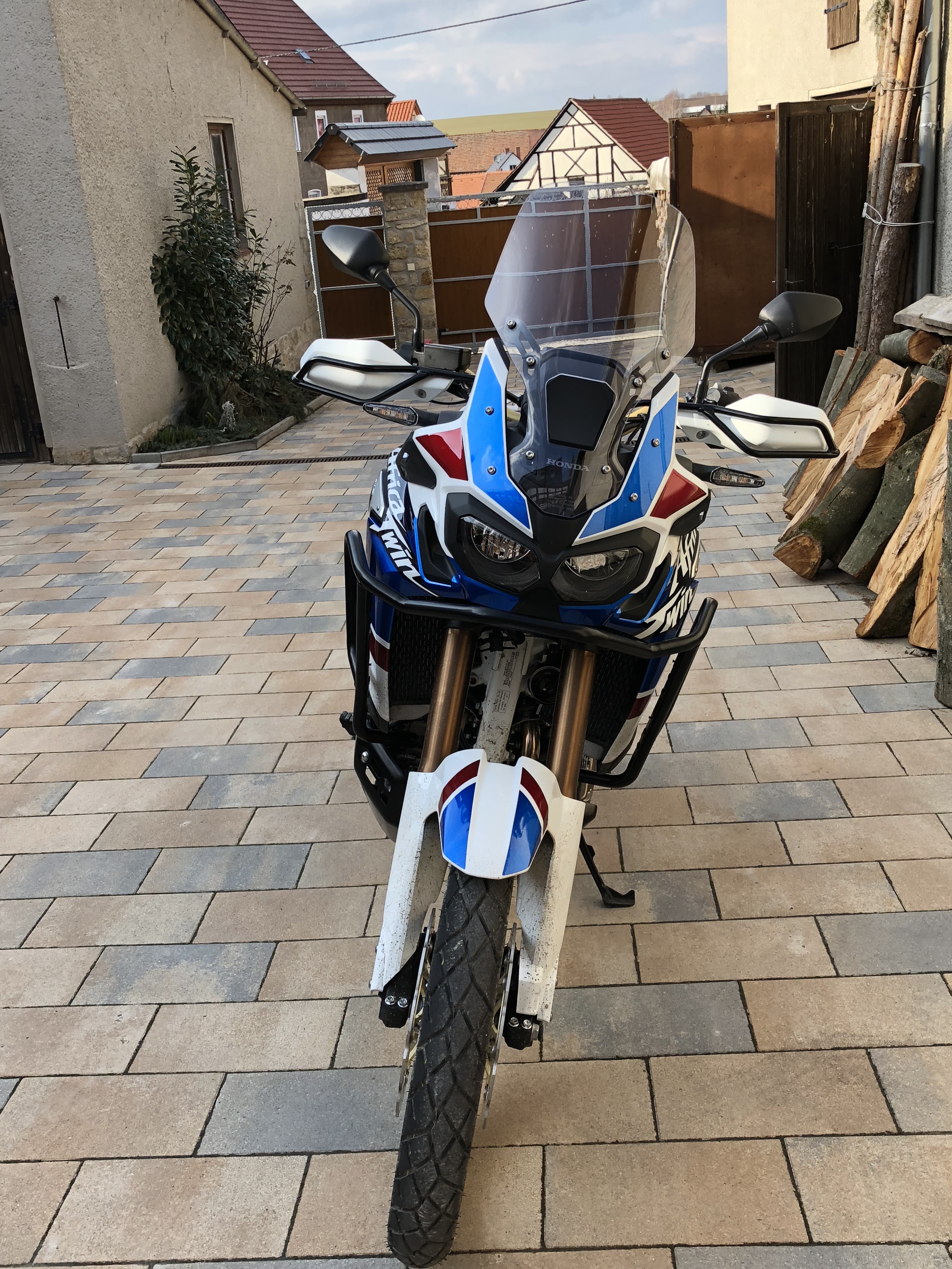 , naja egal es gibt eh noch das eine oder andere Zubehör zu montieren.Bestellt habe ich die AS mit Hauptständer als einzigstes Honda Zubehörteil. Mein sehr freundlicher HH Motoklora in Augsburg hat mir noch meinen Navihalter samt Verkabelung angebaut und mir das Bike vollgetankt bis vor die Haustüre geliefert. Daaankeschöööön