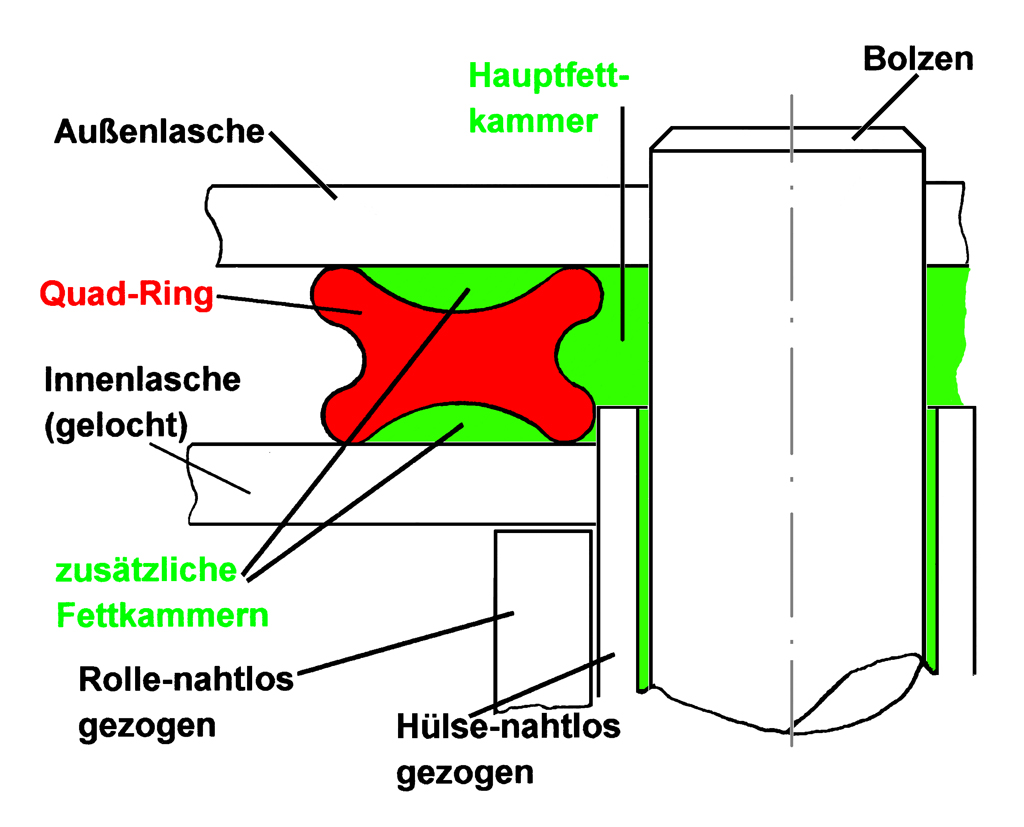 Auf der Hülse läuft aber noch die Kettenrolle, zur Seite hin bilden die Kettenlaschen den Abschluss. Da dichtet keine Dichtung etwas ab, die Fläche zwischen Rolle und der darunter liegenden Hülse muss geschmiert werden, sonst droht Verschleiß.