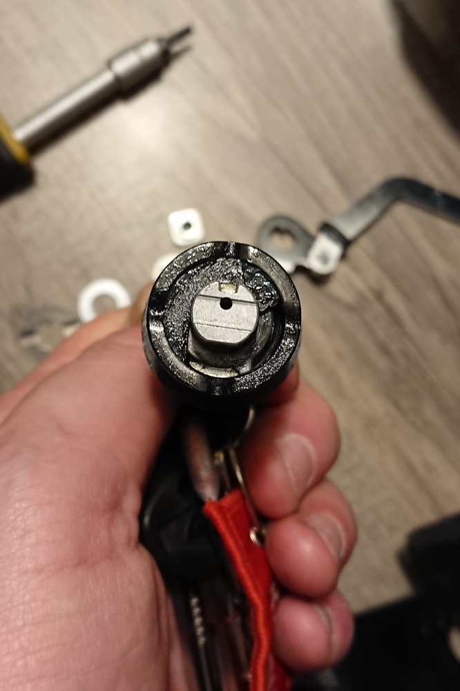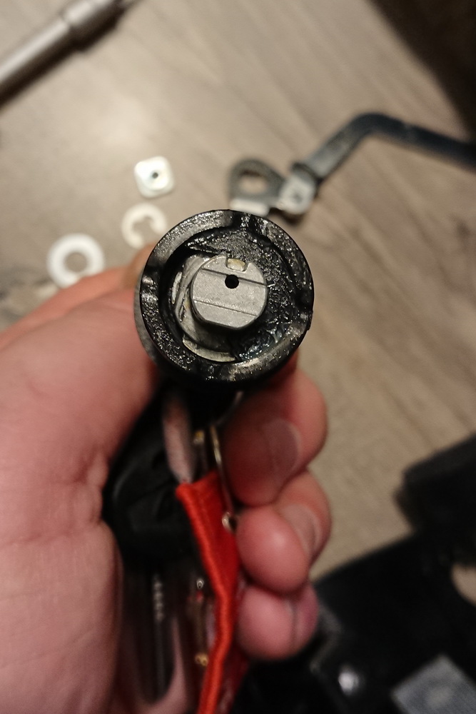 Nach dieser Demontage bleibt ein schwarzer Zylinder übrig in dem der Schliesszylinder mit den Codierplätchen eingesteckt ist.