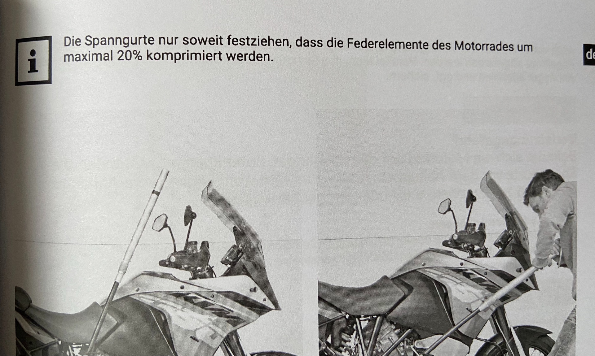 Im Handbuch steht beim Verzurren die Federung nur bis 20% komprimieren. Ich habe das Motorrad aber bestimmt bis 50% verzurrt, da alles es dann erst richtig saß (subjektiver Eindruck). Eigentlich müssen die Gurte ja nur gleichmäßig und fest sein. Das Moped kann ja nirgends hin. Als wir dann durchs Dorf fuhren, hat mich ein Auto angehalten und der Fahrer meinte meine Gurte sind lose… Schreck