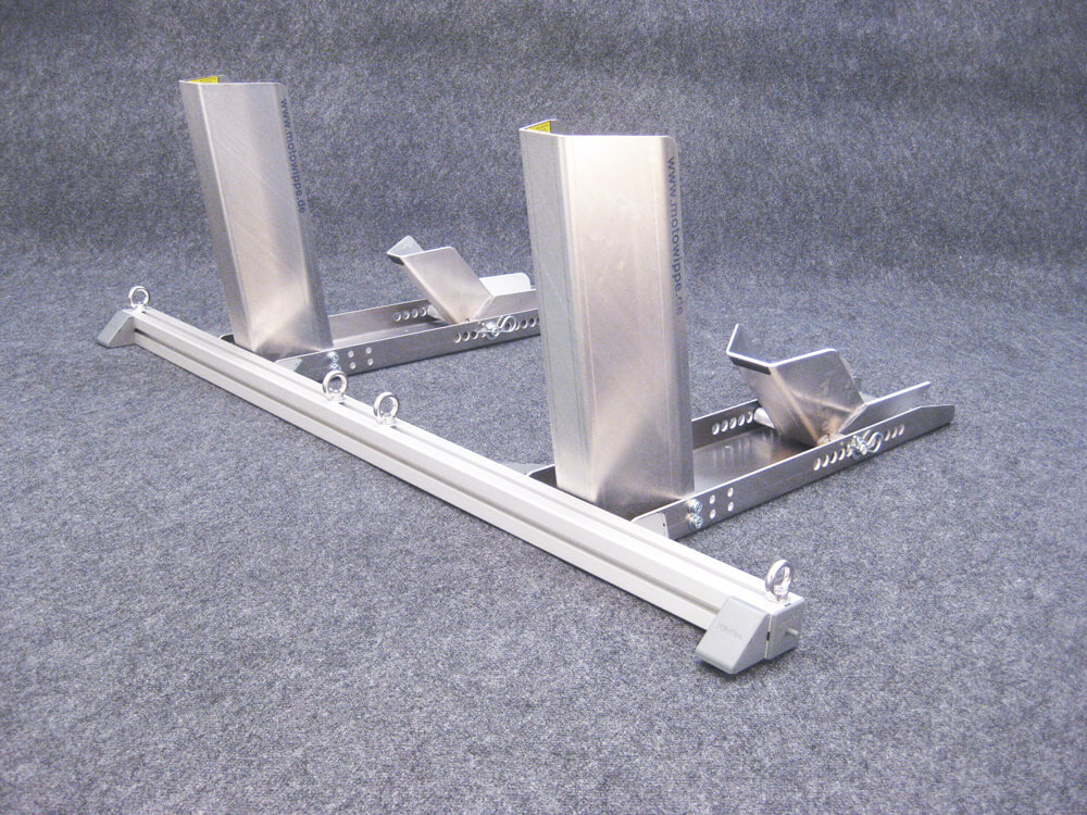 Die Gurte vorne über die Gabelbrücke gespannt und hinten durch das Rahmendreieck gespannt.