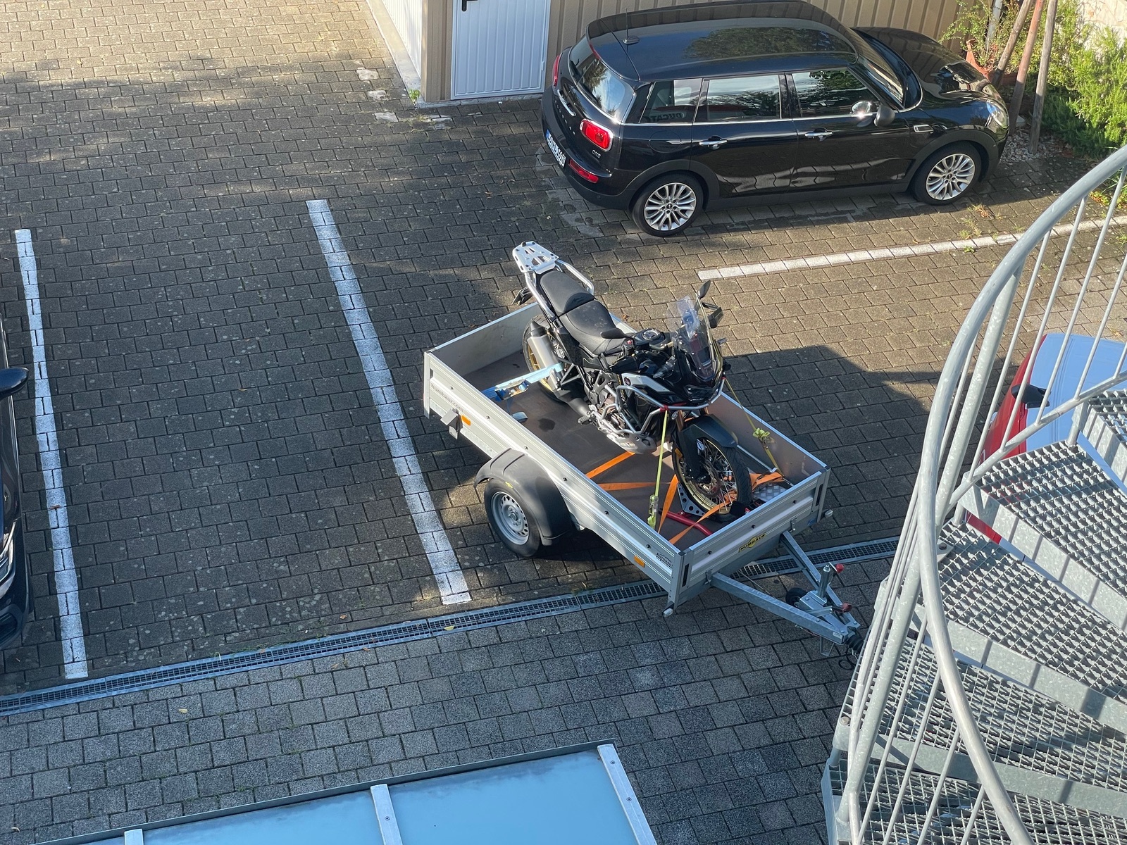 Mein Anhänger ist bereits etwas älter und mein damaliges Motorrad hat da gerade so draufgepasst. Jetzt hab ich mal gemessen, das wird ja mal RICHTIG knapp. Ich kann zwar den Heckspiegel abnehmen, aber auch dann steht das Hinterrad scheinbar gerade so auf der Kante.