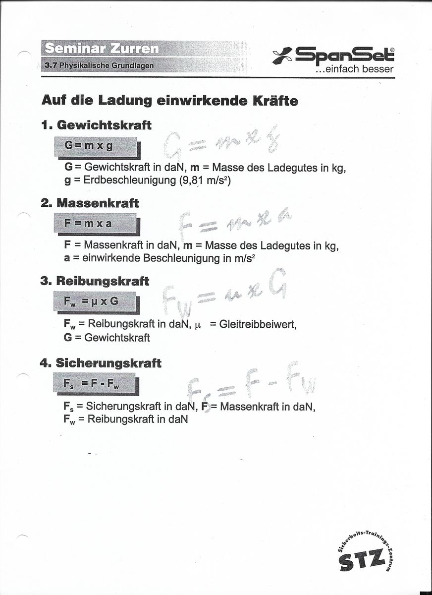 Anbei mal die wichtigsten Infos, auf die es ankommt. Im Prinzip gibt es 2 Arten der Lasi: Niederzurren und Schräg- bzw. Diagonalzurren bei denen sowohl die Winkel als auch der Reibwert wichtige Rollen spielen. Am Besten ist jedoch eine Kombination aus den vorgenannten Zurrarten mit Formschluss (da z.b. Ladebordwände ebenfalls Kraft aufnehmen und in die Berechnung einfließen können).