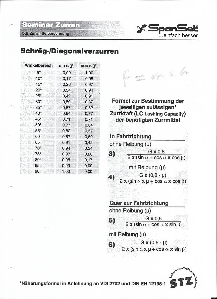 Anbei mal die wichtigsten Infos, auf die es ankommt. Im Prinzip gibt es 2 Arten der Lasi: Niederzurren und Schräg- bzw. Diagonalzurren bei denen sowohl die Winkel als auch der Reibwert wichtige Rollen spielen. Am Besten ist jedoch eine Kombination aus den vorgenannten Zurrarten mit Formschluss (da z.b. Ladebordwände ebenfalls Kraft aufnehmen und in die Berechnung einfließen können).